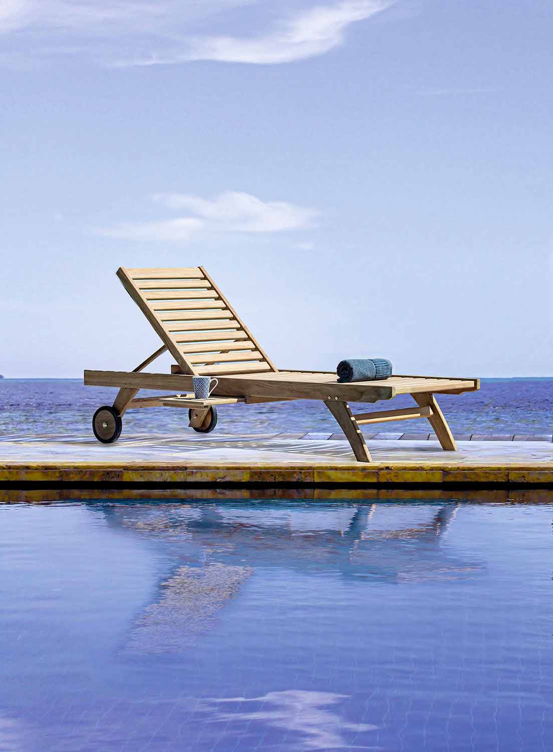 Venkovní design solárium s koly, sklápěcí a úložný prostor z teakového dřeva.