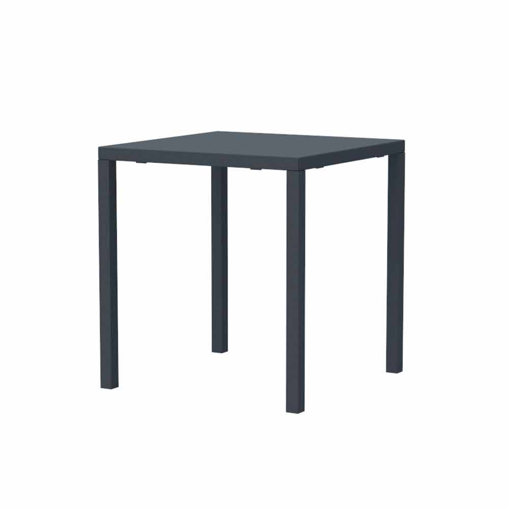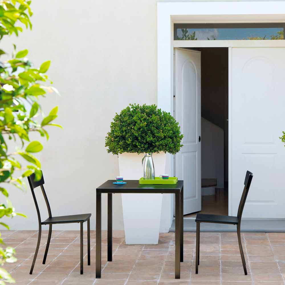 Čtvercový venkovní stůl z práškově lakovaného pozinkovaného železa, samonivelační a stohovatelný, vyrobený v Itálii.
