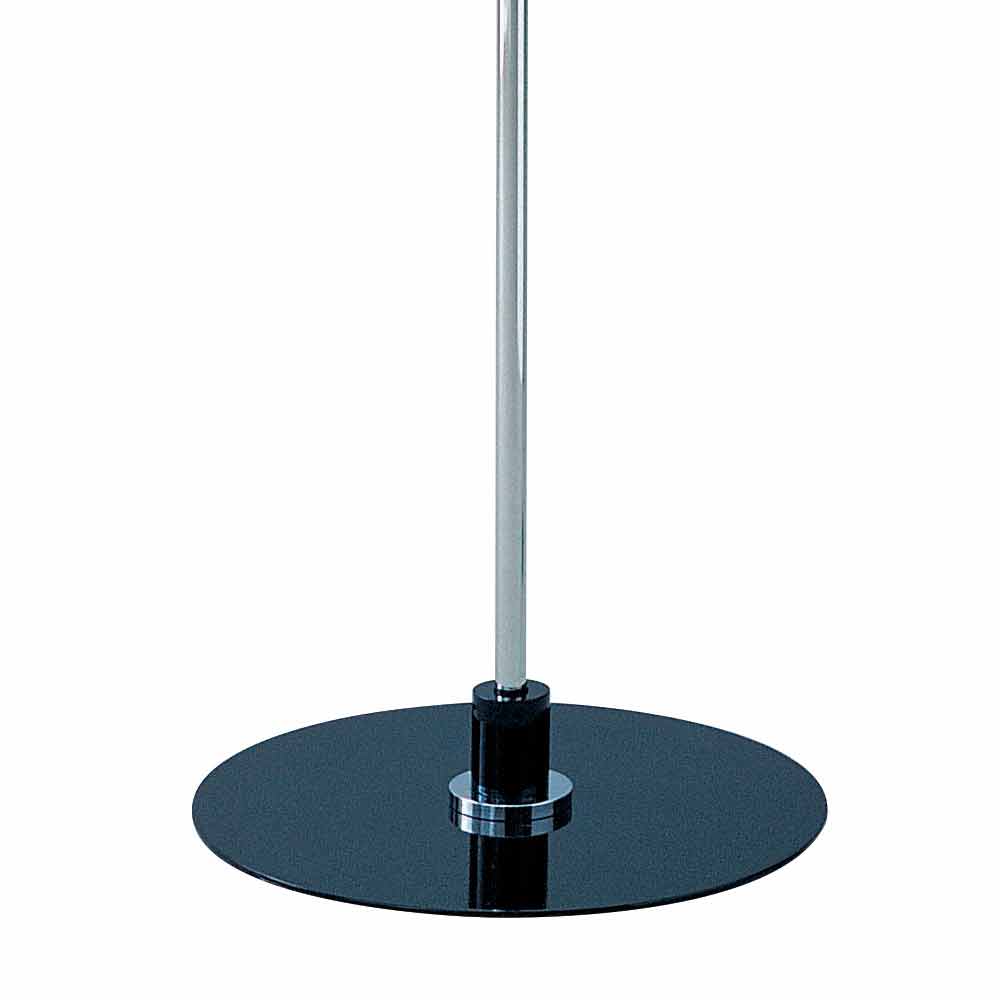 Stojací lampa s chromovanou strukturou , skleněnou deskou a černě lakovanou základnou a příslušenstvím. Nápad na vybavení, který vychází z myšlenky a 100% Made in Italy produkce navržené tak, aby nabídlo funkční osvětlení a avantgardní design . Tento typ výrobku umožňuje vylepšit a učinit každou místnost domu, do které je vložen, přívětivou a také díky použití jednoduchých linií, které dodávají život novým a obzvláště všestranným tvarům, což umožňuje lampě snadno se přizpůsobit jakémukoli modernímu stylistická situace, sňatek bezvadným způsobem. se zbytkem nábytku a homogenním dokončením. Výsledkem je lampa schopná obsáhnout všechny základní aspekty, o které se usiluje, představením praktického a funkčního zdroje světla, aniž by se opomíjelo estetické hledisko, které je zásadní pro harmonickou a příjemnou atmosféru .
