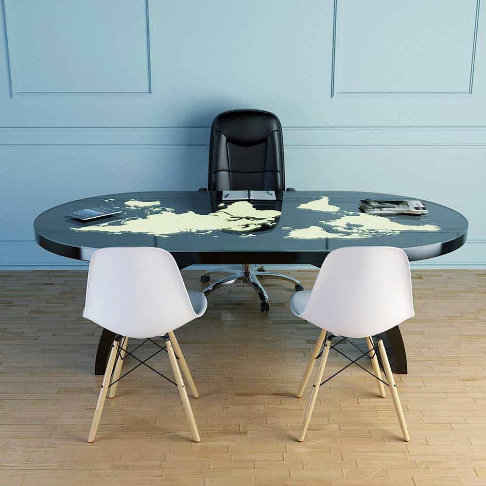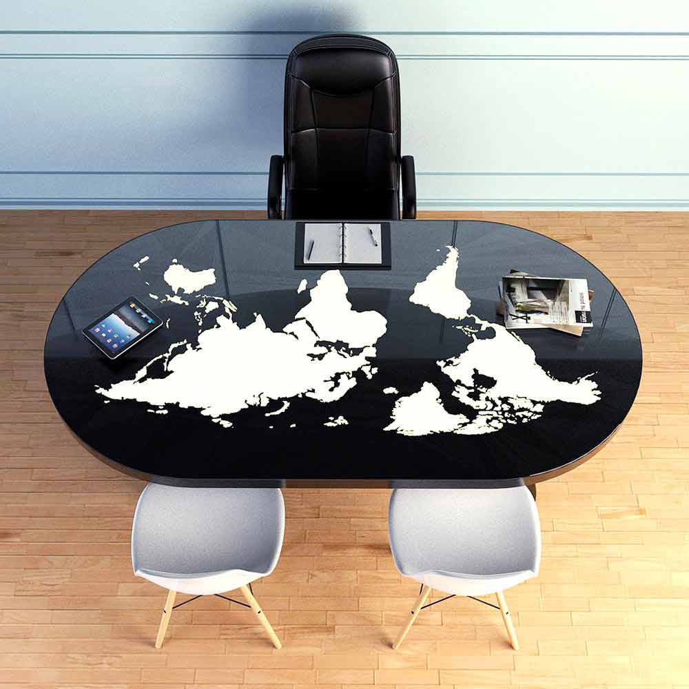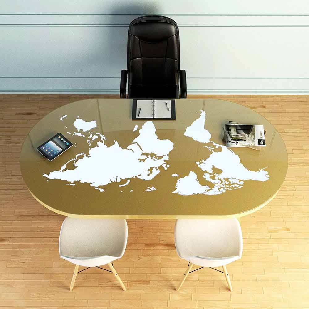Pontida je psací stůl s ultramoderním designem; vyrobeno z Solid Surface® a skleněné desky, kde je zastoupen celý svět, který díky přítomnosti LED svítí a mění barvu, jak si přejete.