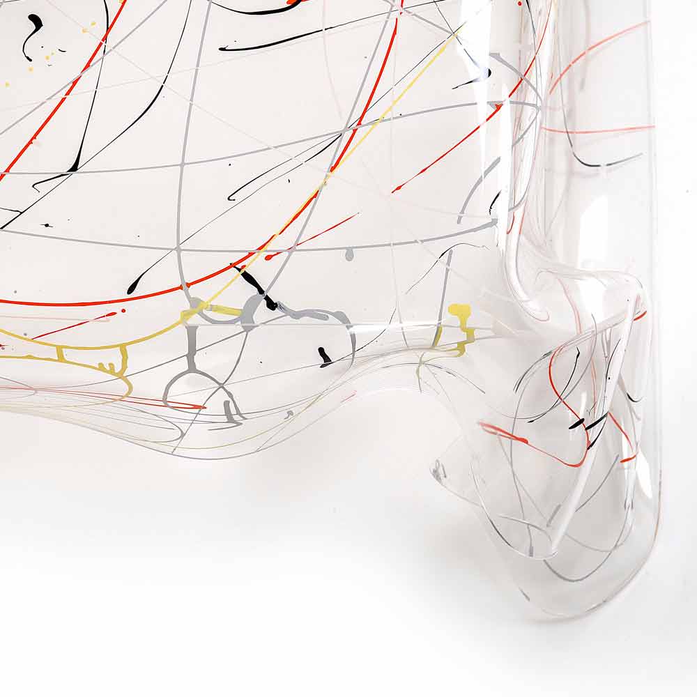 List čistého panenského polymeru 100% PMMA plexiskla s rozprašovací barvou; je při vysokých teplotách přehozena rukou, aby vytvořila jedinečný a neopakovatelný stůl. Stavba je zcela samonosná.