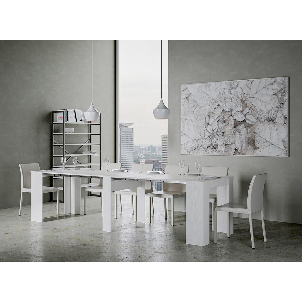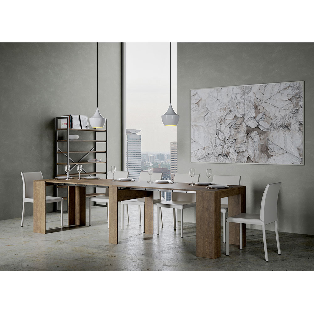 Jeho funkční design zahrnuje vnitřní výsuvy, což je detail, který zvyšuje praktičnost, aniž by byl obětován styl: konzolový stolek se několika pohyby promění z elegantní odkládací jednotky na prostorný stůl, připravený přivítat hosty na nezapomenutelné večeři nebo posloužit jako velká pracovní plocha.