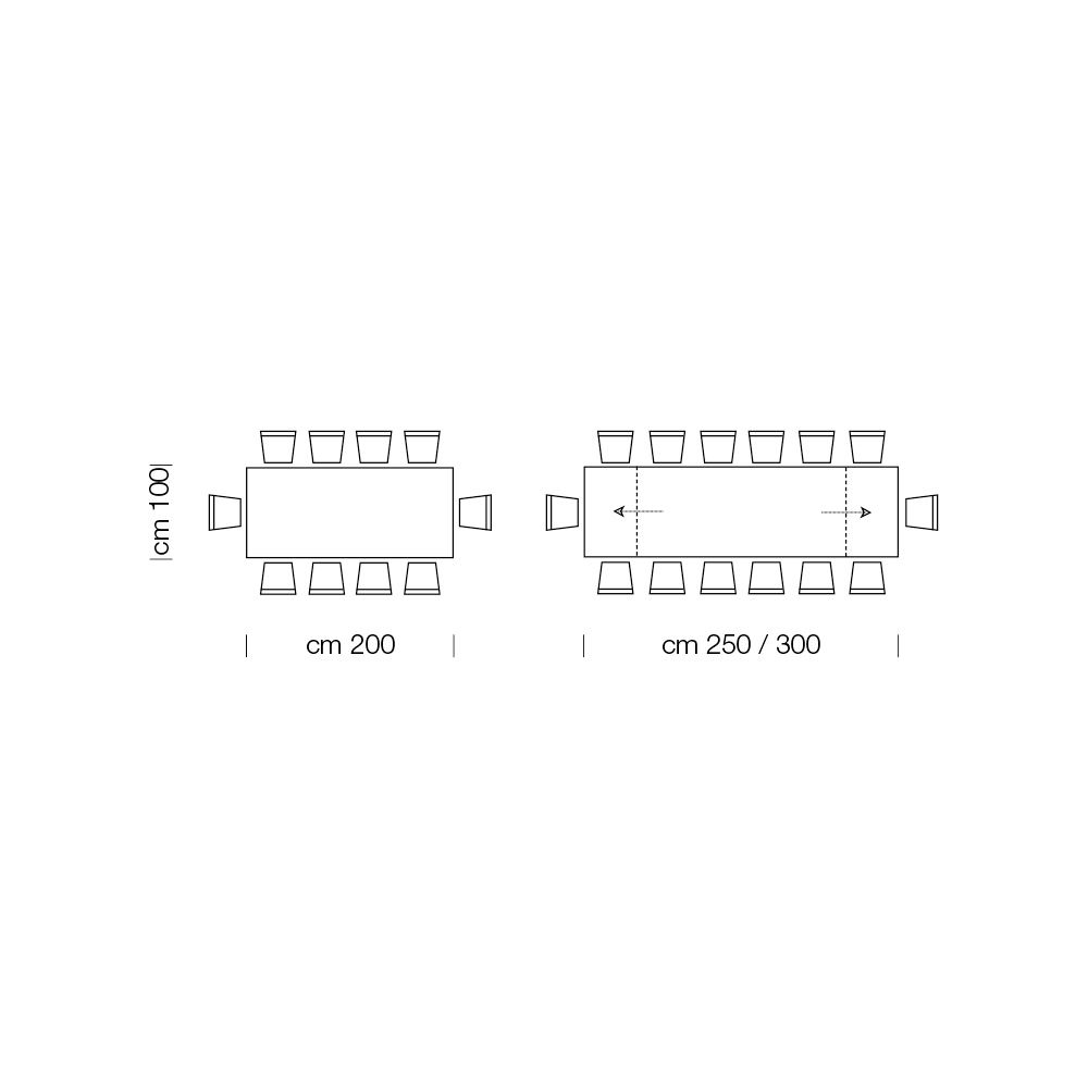 - L 200 (300) x H 100 x V 76,5 cm 14místný rozšiřitelný pomocí dvou 50 cm vnějších nástavců.