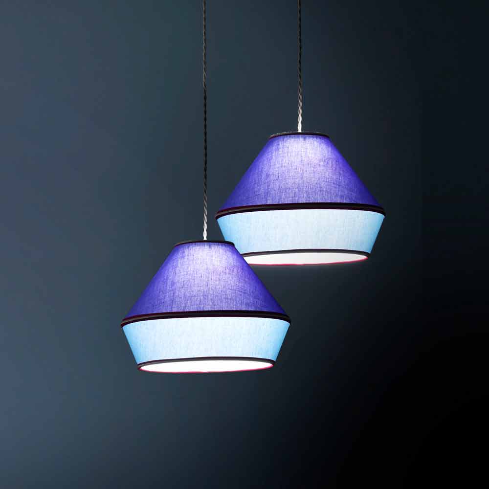 Tato závěsná lampa je vyrobena výhradně v Itálii a skládá se z modrého a světle modrého bavlněného stínítka obohaceného o červené a bílé vložky, které zvyšují její estetickou hodnotu, díky čemuž jsou jedinečné a originální design .