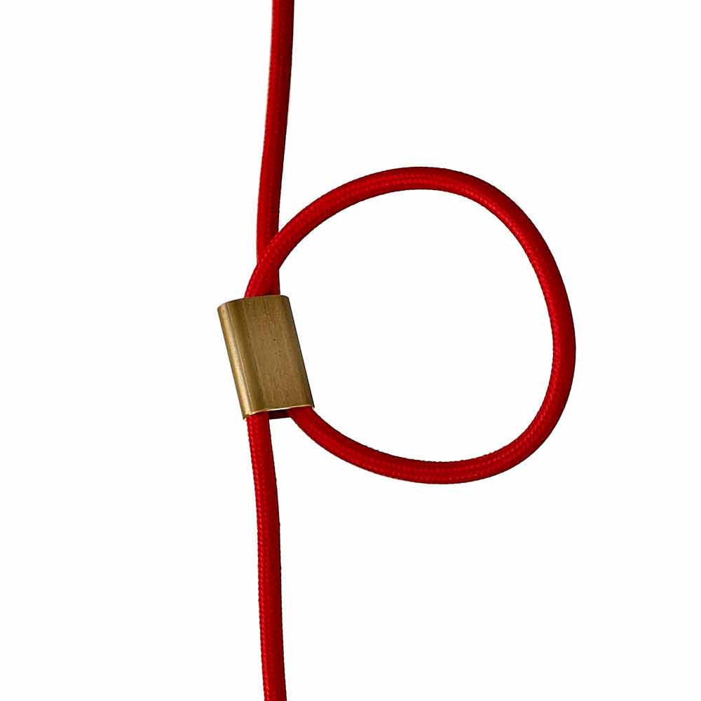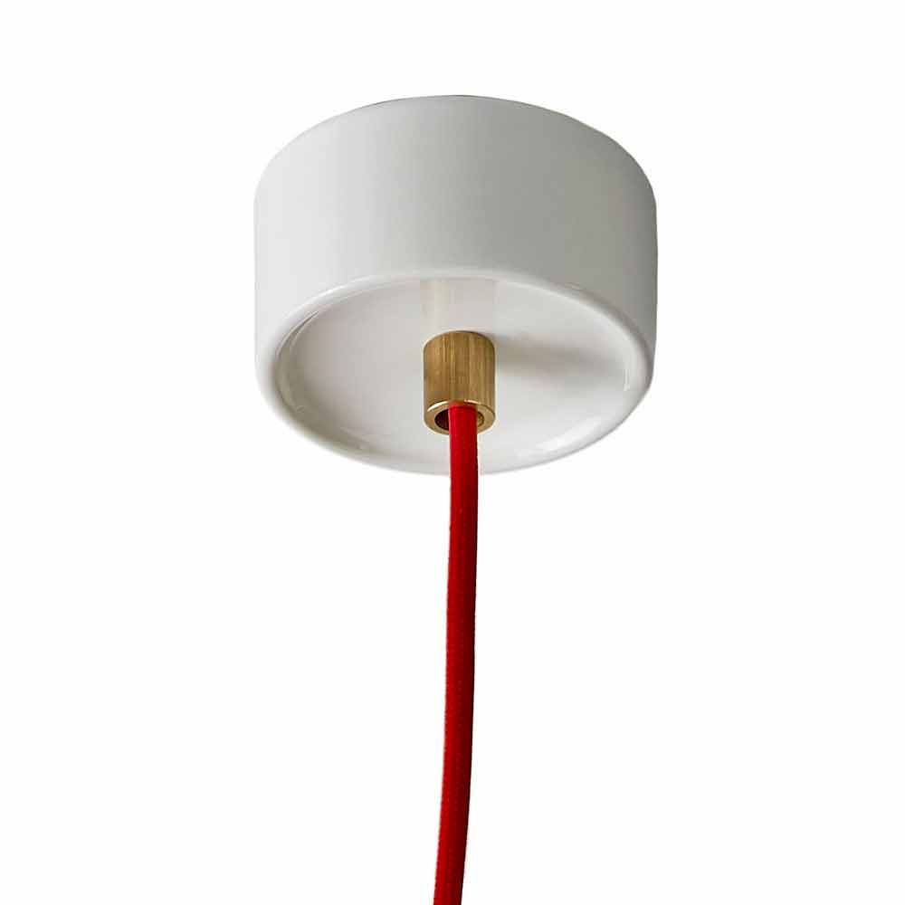 Barevná závěsná svítidla v bílém keramickém a bukovém dřevě s červeným hadříkem a mosazným kabelovým svorkou.