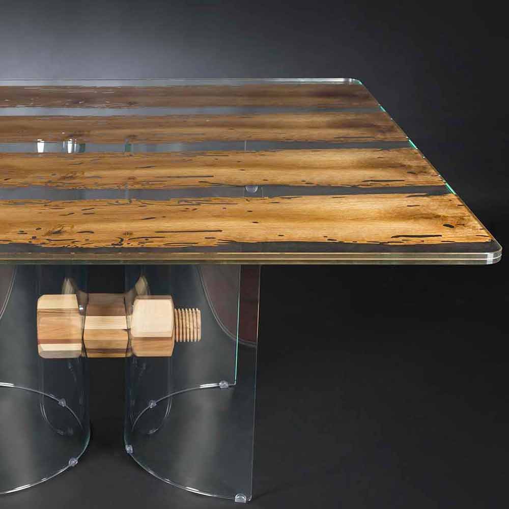 jednoduché a elegantní, čtvercový tvar a jedinečný design a nenapodobitelná vhodný pro každý typ nábytku tabulky. V něm dřevo „Briccole“ a skloviny do teplé a nerozlučné objetí. Jedinečnou vlastností této tabulky spočívá v jeho základnou, vytvořenou ze zakřiveného skla spojeny pomocí šroubu a matice konstrukce, vyrobené s různých druhů dřeva v jemné zpracování řemeslníka skříněk.