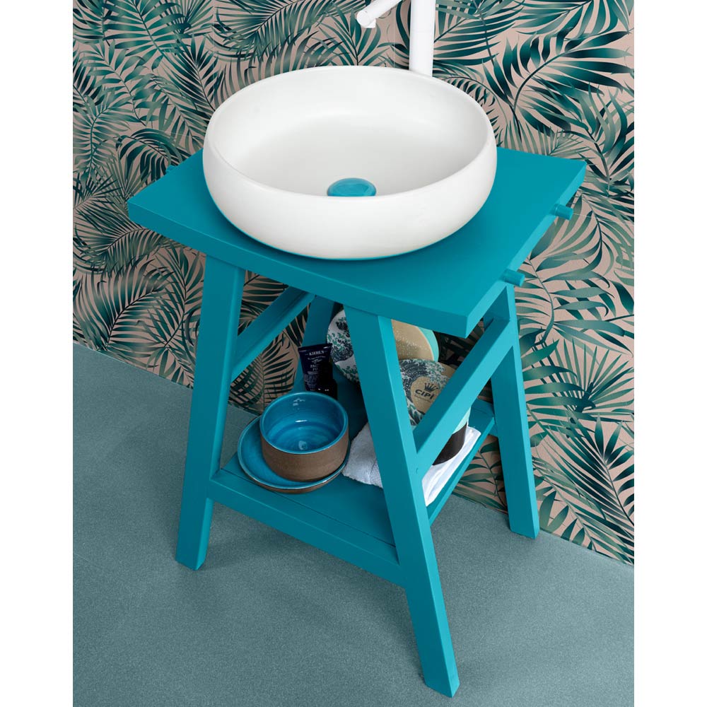 Volně stojící koupelnová skříňka vyrobená z přírodního regenerovaného modře lakovaného teaku , barva, která odkazuje na klid a vyrovnanost, vytváří pocit ponoření do modři Sardinského moře, emoce, která odkazuje na ohromující kouzlo přírody vnitrozemí. Jeho struktura se vyznačuje mírně zakřiveným tvarem svršku, který nabízí exkluzivní a rafinovaný dotek estetiky produktu. Kompletní se 4 praktickými háčky na ručníky a funkční odkládací policí .