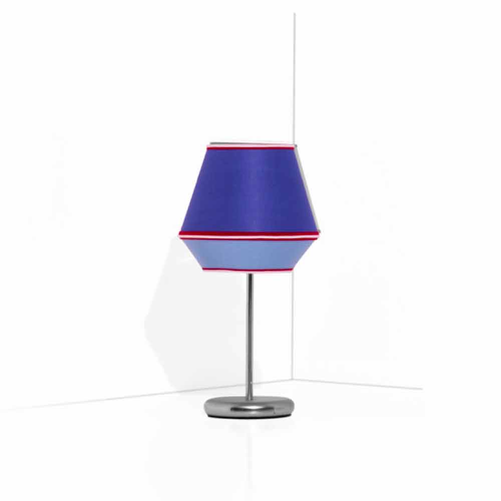 Tato stolní lampa je vyrobena výhradně v Itálii a skládá se z chromovaného kovového podstavce, na kterém je instalováno modré a světle modré bavlněné stínítko obohacené červenobílými vložkami.