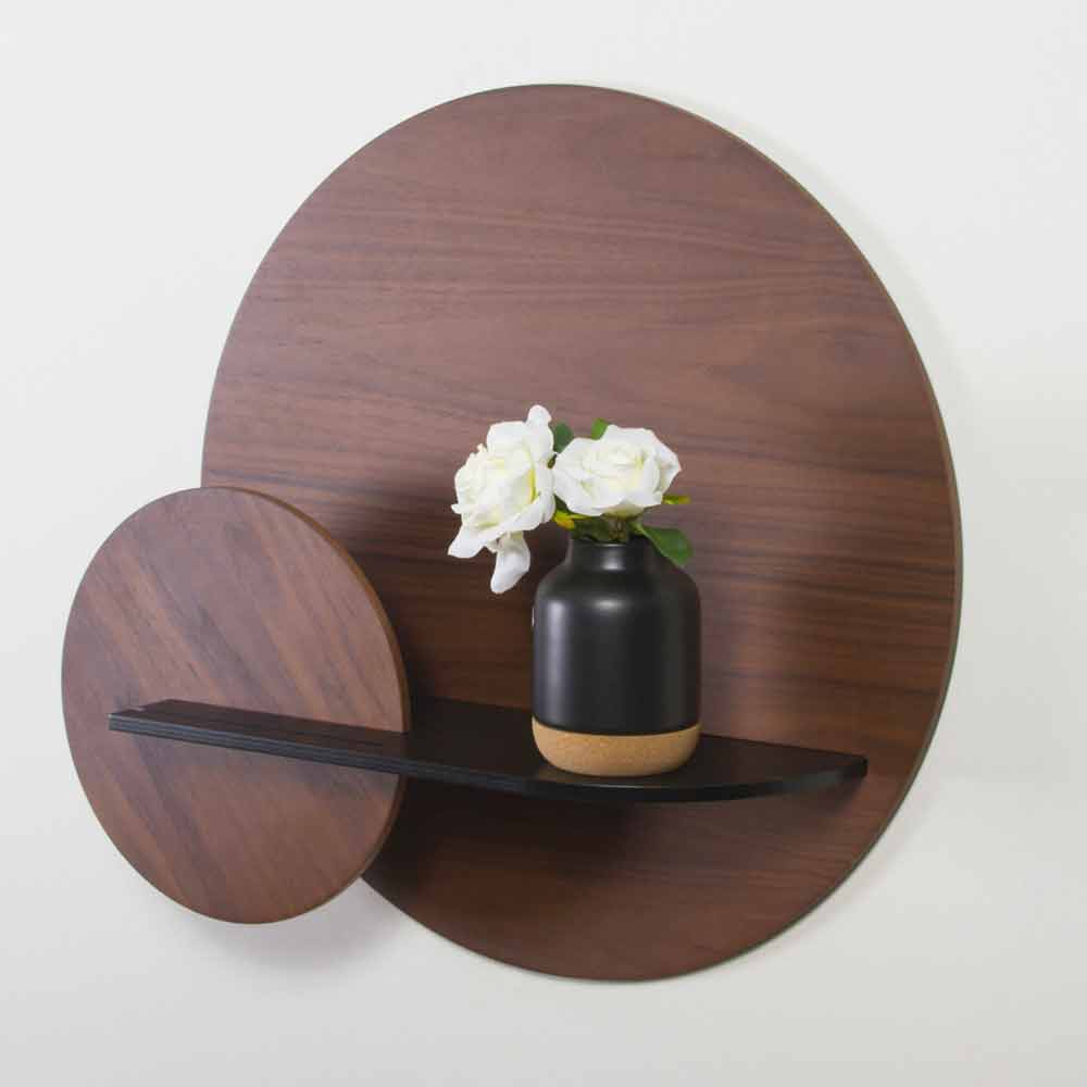 Tato police se skládá ze 3 překližkových panelů, z nichž jeden je v provedení s černým mořeným popelem připevněným ke stěně kovovou podpěrou, která působí jako skutečná opěrná plocha, a ze dvou dalších vertikálně namontovaných kulatých panelů vyrobených v provedení z ořechového dřeva , které lze položit v 8 různých konfiguracích, které umožňují získat produkt přizpůsobitelný podle vkusu a potřeb. Za účelem dalšího zvýšení funkčnosti tohoto nádherného článku je za menším svislým panelem umístěn praktický otvor pro kabel , ideální pro skrytí jakéhokoli typu kabelu nebo nabíječky.