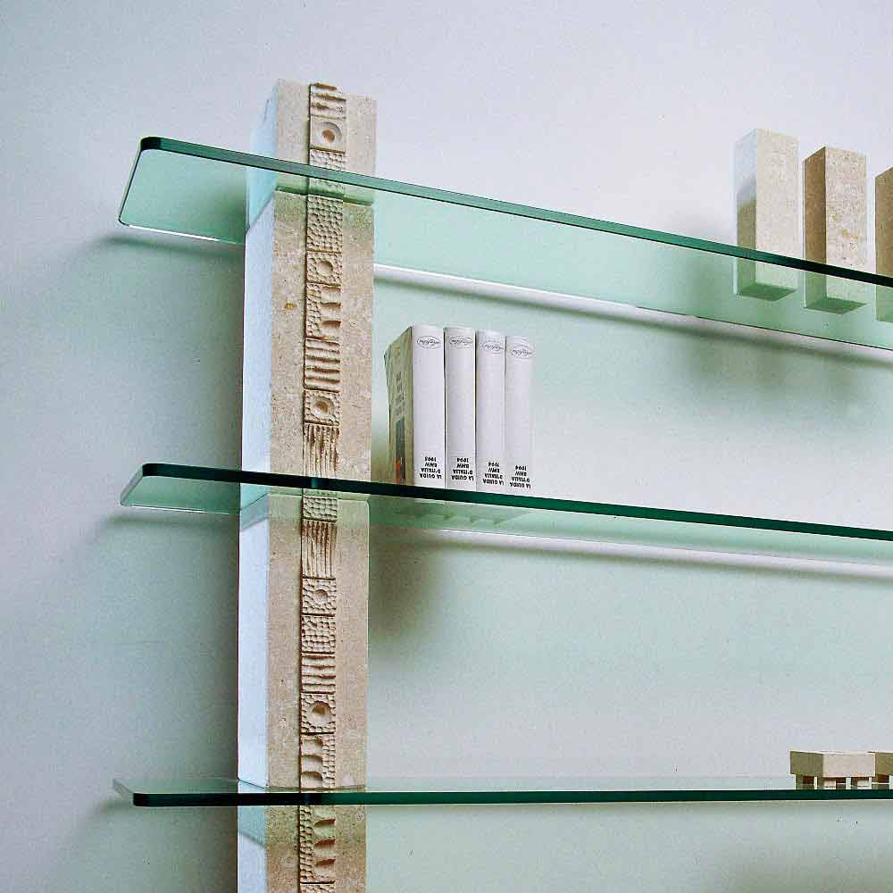 Modulová knihovna Vyrobeno v Itálii z kamene a skla s vnitřní bezpečnostní strukturou, z leštěného bílého kamene Vicenza s ruční dekorací na přední straně. Skleněné regály o rozměrech 160x30 cm a 15 mm, na základně 2 desky v saténové ocelové konstrukci zajišťují stabilitu konstrukce.