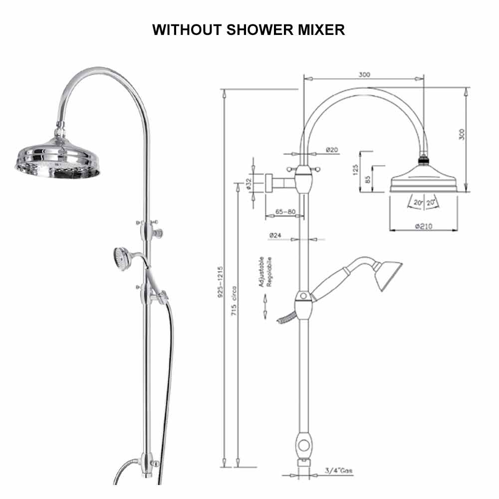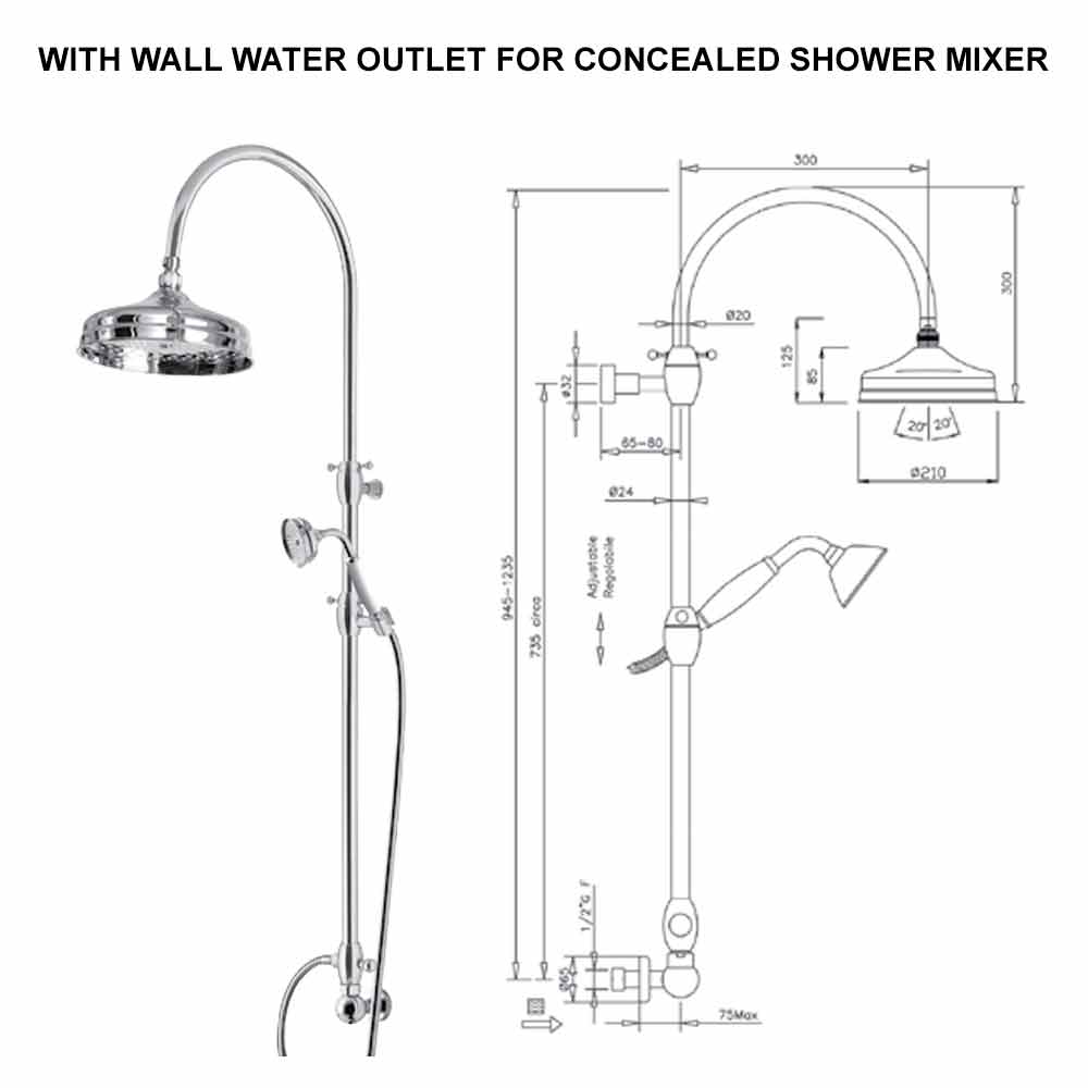 Mosazný sprchový sloup s klasickým designem sprchové hlavice a ruční sprchy, vysoká kvalita Made in Italy.