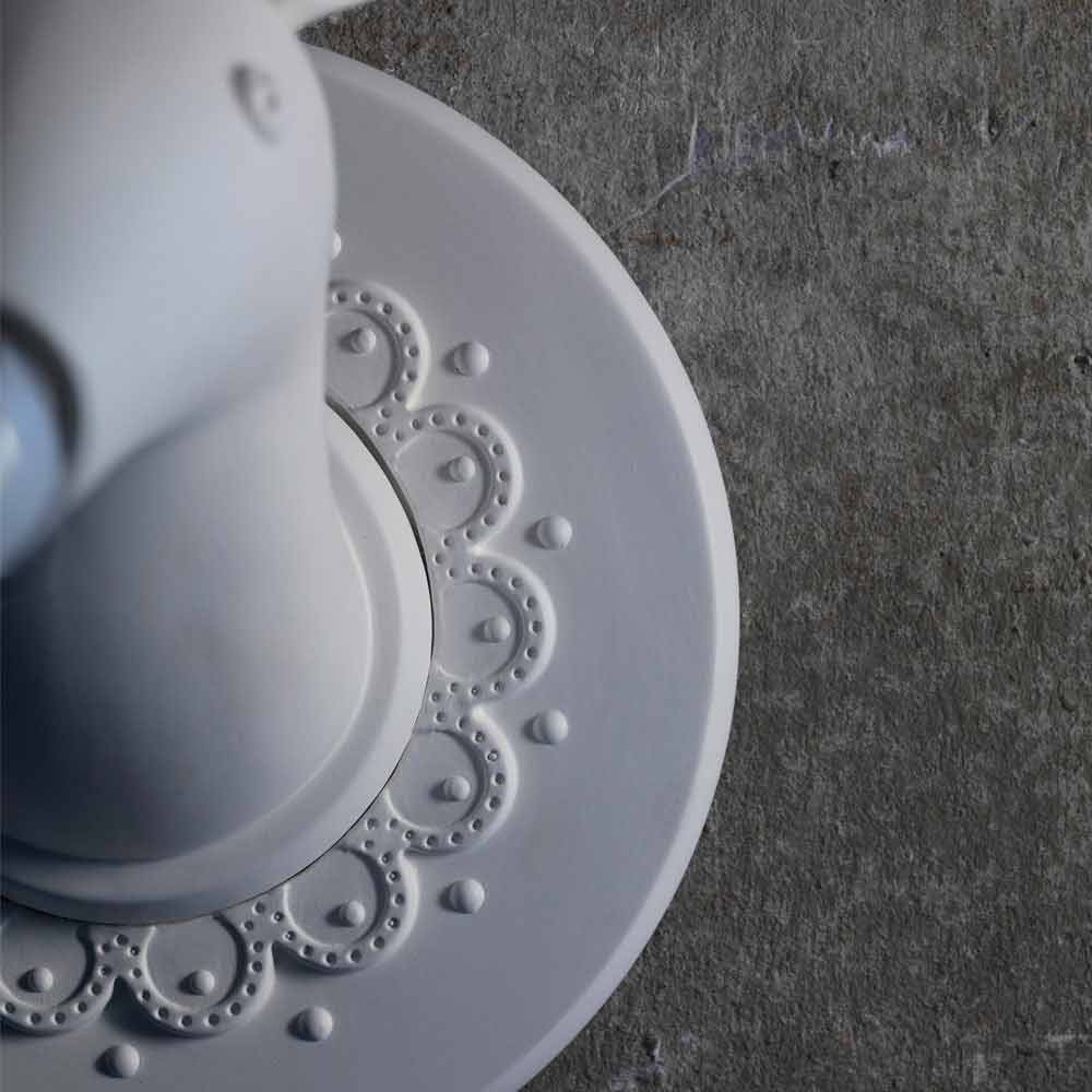 Lampa je vyrobena z neprůhledné bílé keramiky jako materiál, který představuje původ, tvárnost, stvoření a který vede přímo k počátkům naší kultury.