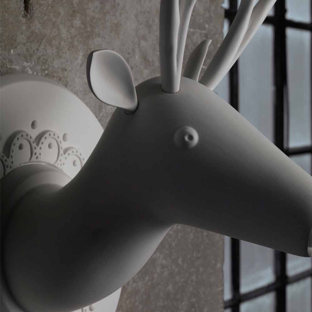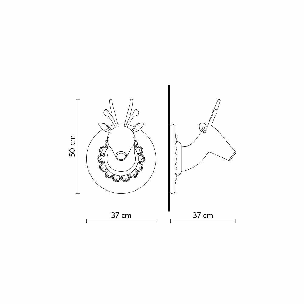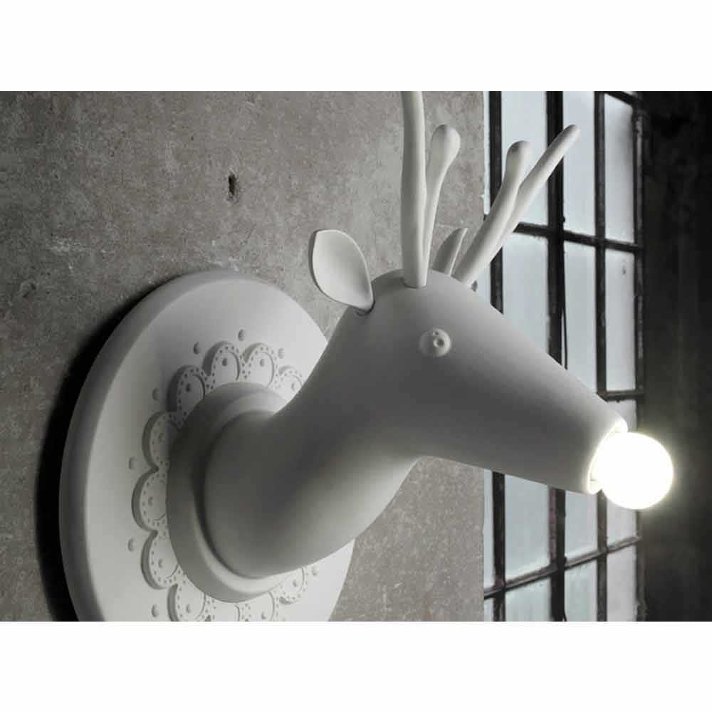 Tato originální a jedinečná nástěnná nástěnná malba zobrazuje jelena ze světa pohádek, protože místo úst najdeme žárovku, která symbolizuje jazyk světla, kterým je zvíře schopné mluvit, dychtivě zdůrazňovat autentičnost a tisíc odstínů, které charakterizovat osobnost každého z nich prostřednictvím zastoupení světelných prvků s jedinečným a inovativním designem