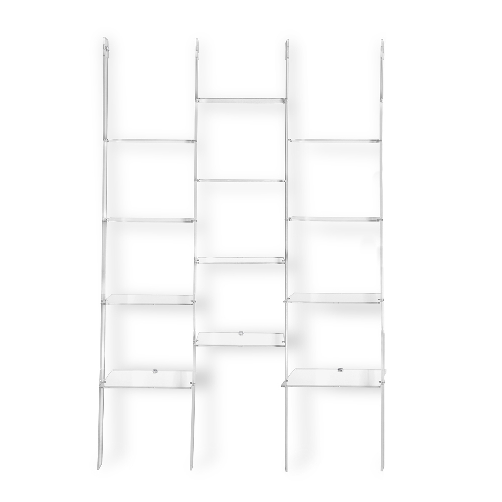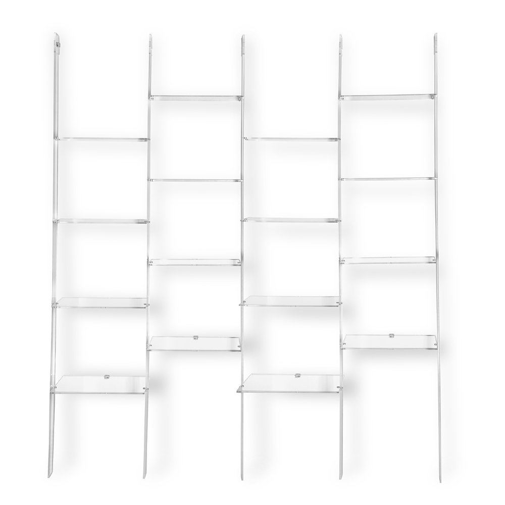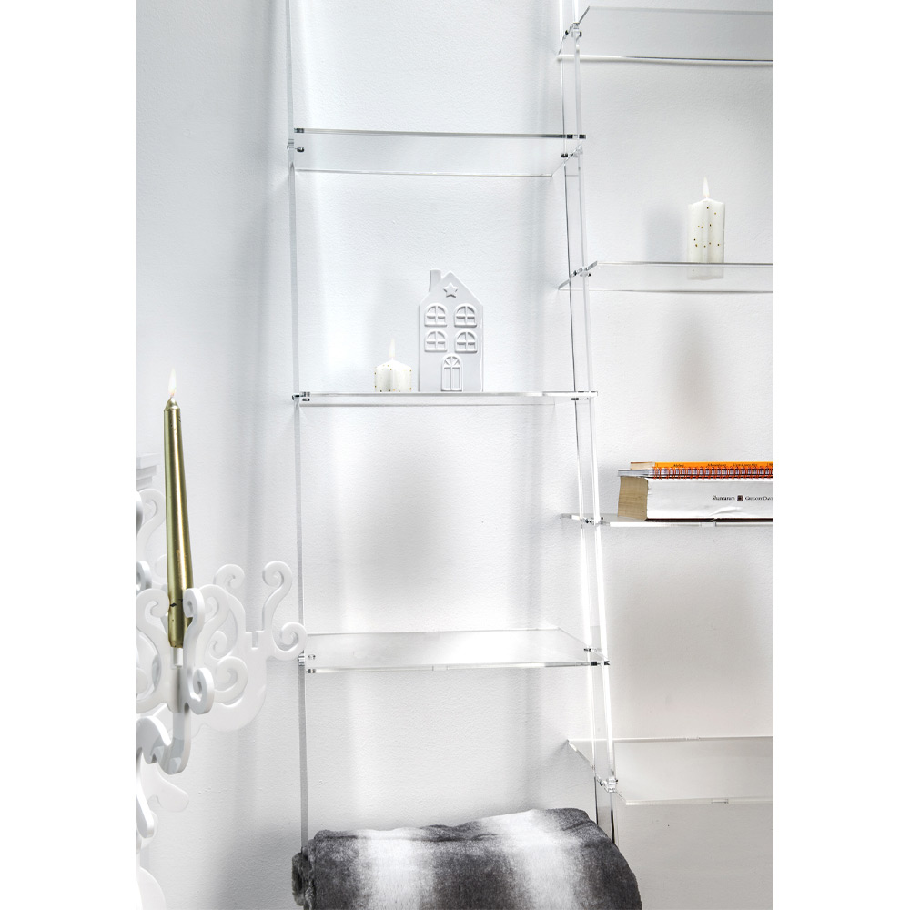 Nástěnná knihovna ve tvaru žebříku s až 4 prvky z průhledného plexiskla italské výroby.