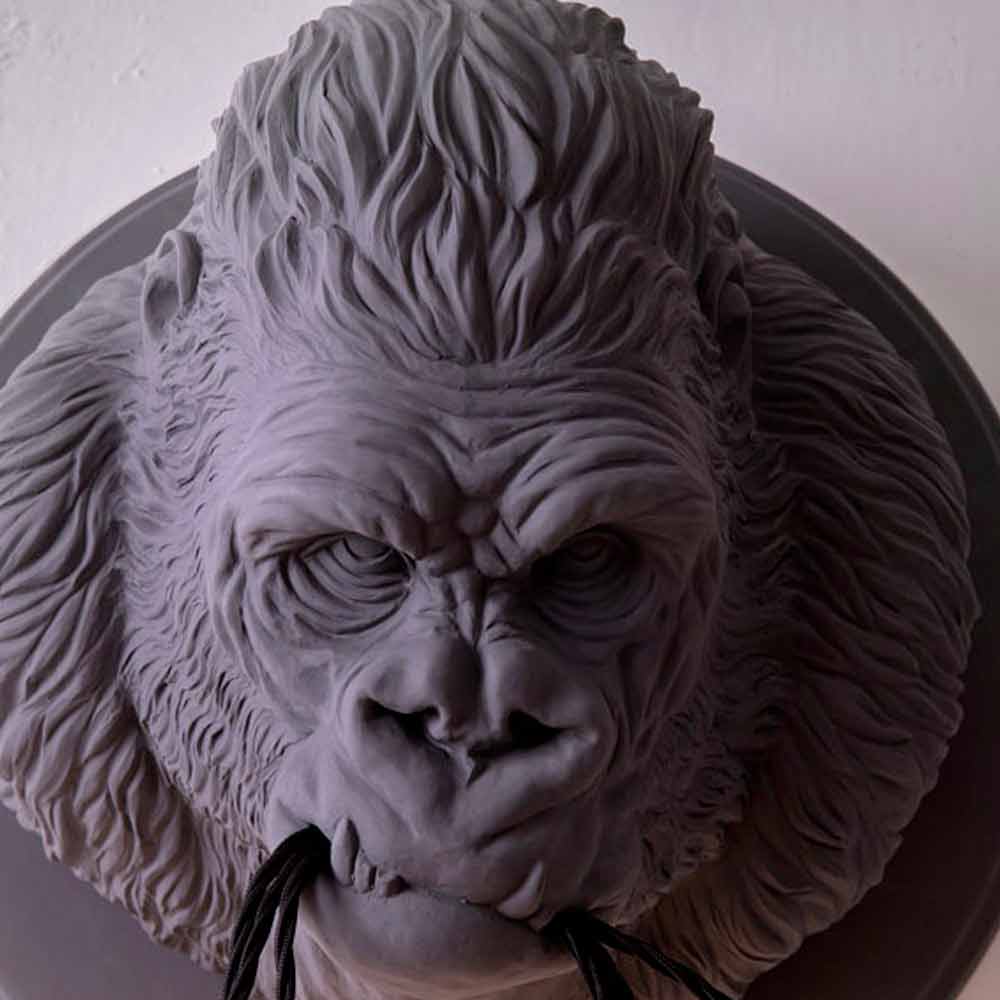 keramická gorila trhá jeden z největších vynálezů člověka, aby symbolizovala to, co je v schopný dělat vůči přírodě a jejím bližním.