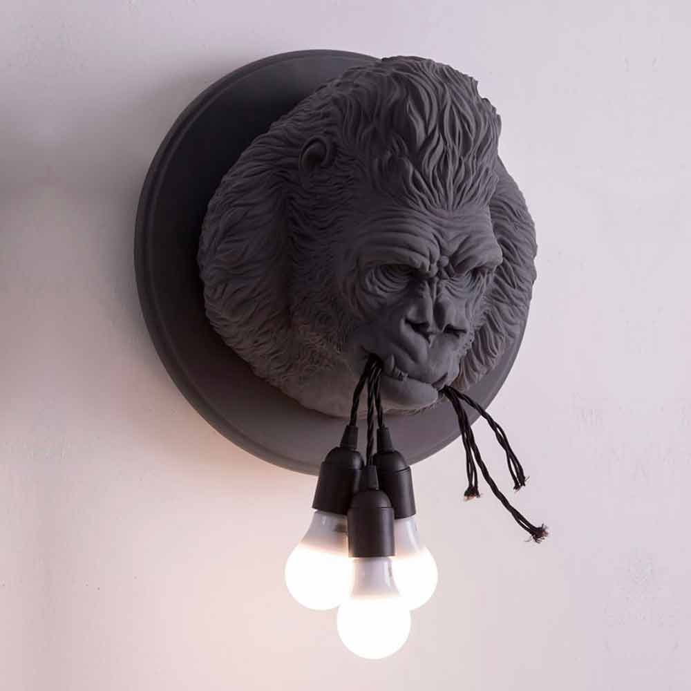 Nástěnná lampa z bílé nebo šedé keramiky ve tvaru gorily, ručně vyrobený výrobek vyrobený v Itálii.