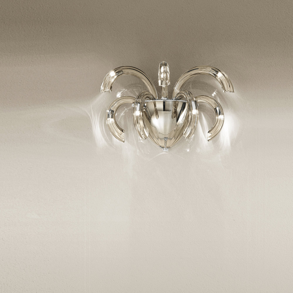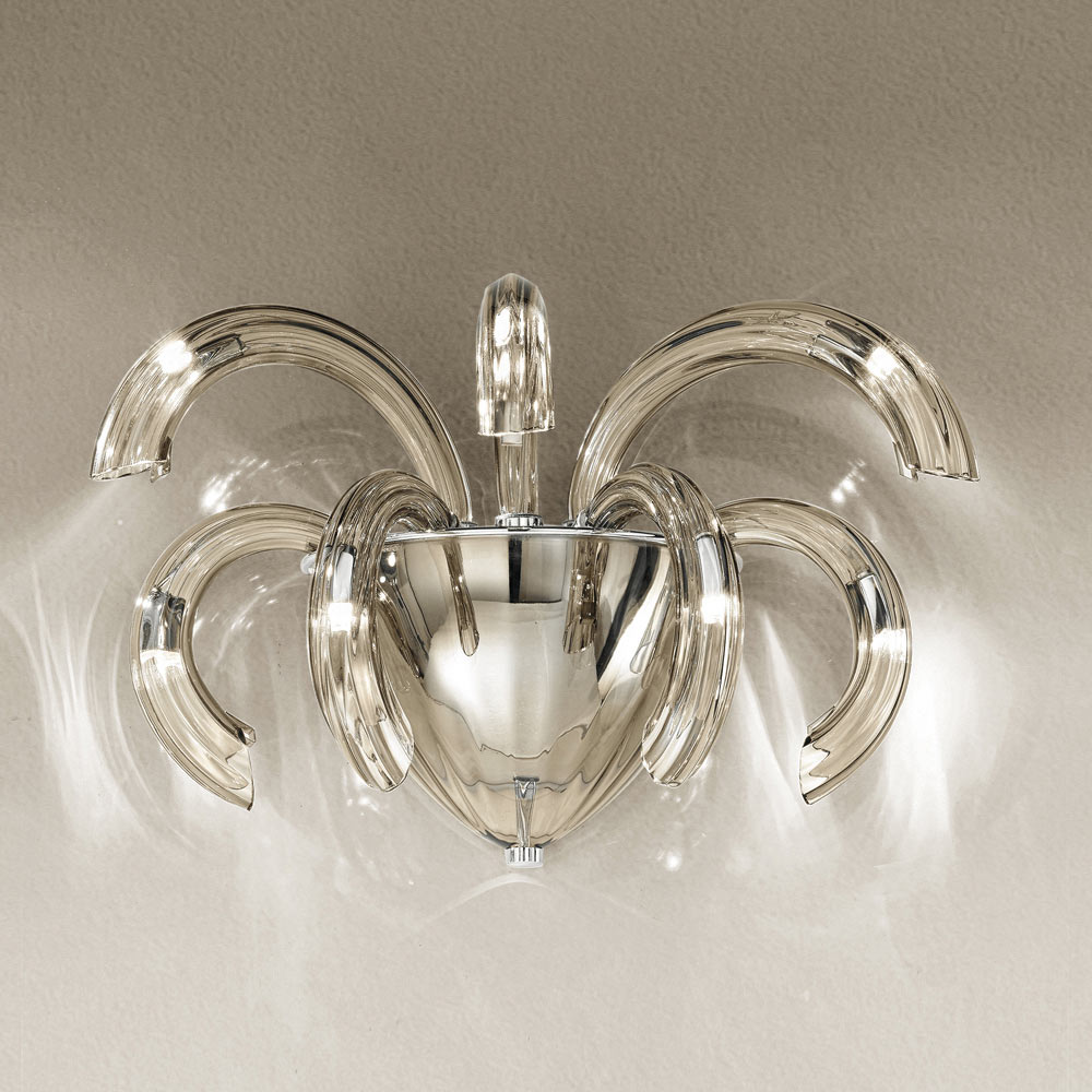 Nástěnná lampa ručně vyrobená v Itálii z benátského skla, kouřová povrchová úprava s chromovanými kovovými detaily. Poutavá estetika, která se díky svým tvarům a funkčnosti designu přizpůsobí jakémukoli typu prostředí, do kterého se s nadšením hodí. Nádherná a elegantní zakřivená ramena se roztahují směrem ven, aby přinášela světlo různými směry a osvětlovala místnost originálním scénografickým efektem , který připomíná explozi ohňostrojů pro kreativní , rafinovaný a silný vizuální efekt .