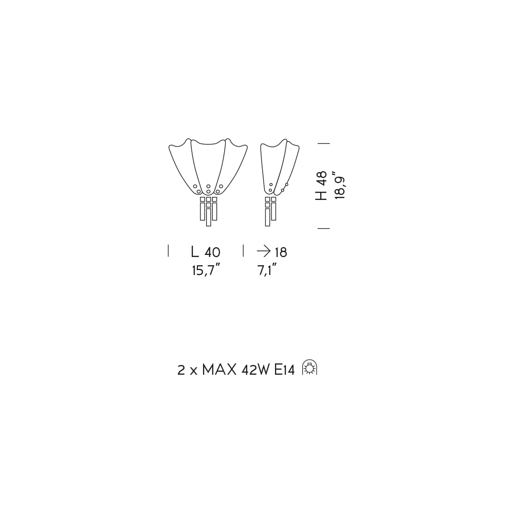 Nástěnná lampa z ručně vyráběného benátského skla s bílými kovovými detaily. Vytříbená estetika se silným vizuálním dopadem, která okouzlí výrazovou silou , která charakterizuje její klenuté tvary získané speciálním zpracováním technikou talíře. Nádherné geometrické textury, která pokrývá celý povrch lampy, je místo toho dosaženo díky zpracování skla za tepla , které je také zdobeno závěsnými hranoly, které zdůrazňují a činí lom světla jedinečným pro jedinečný, exkluzivní a rafinovaný výsledek.