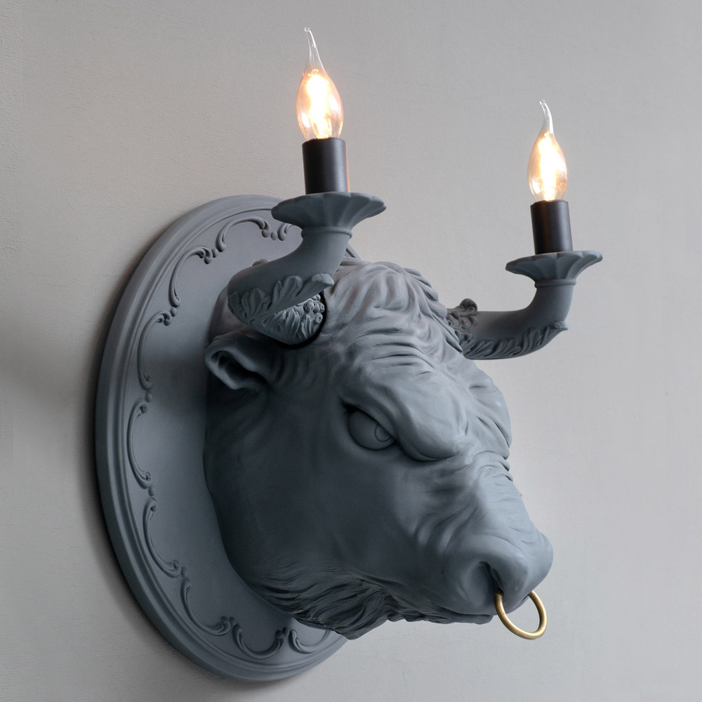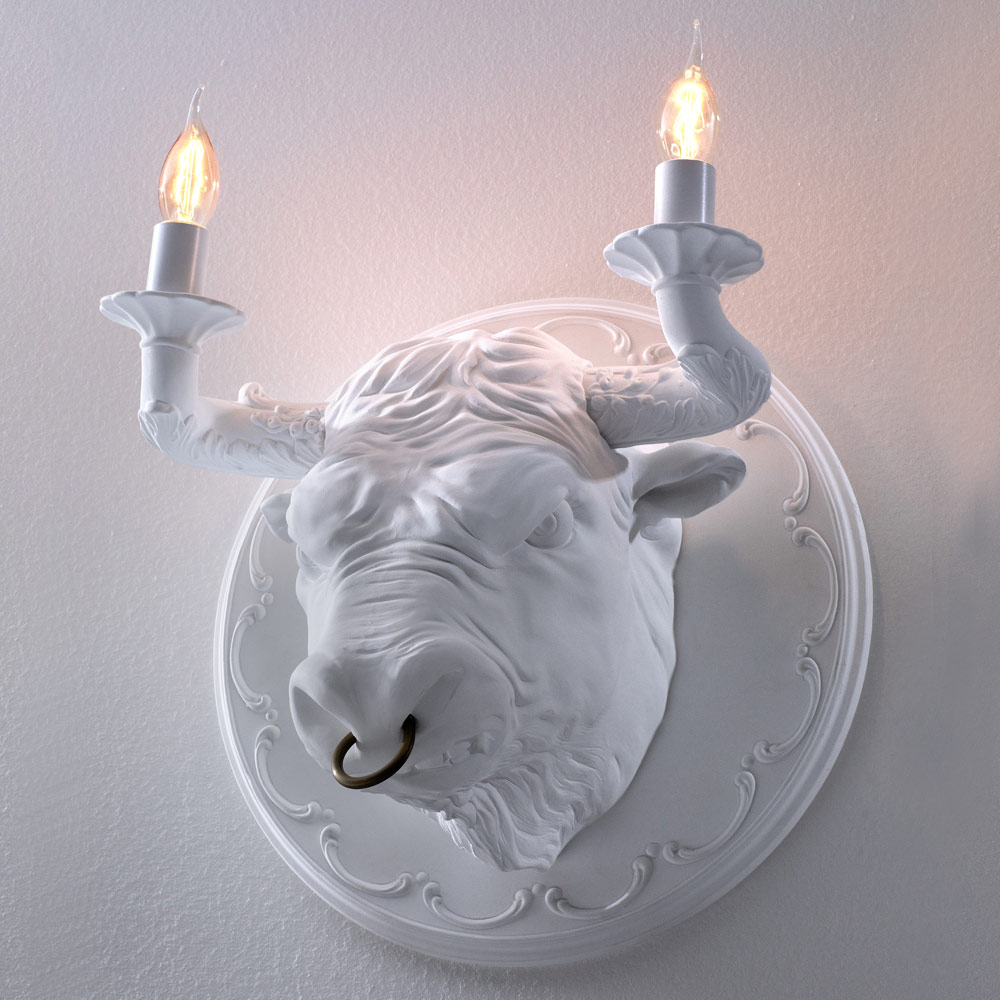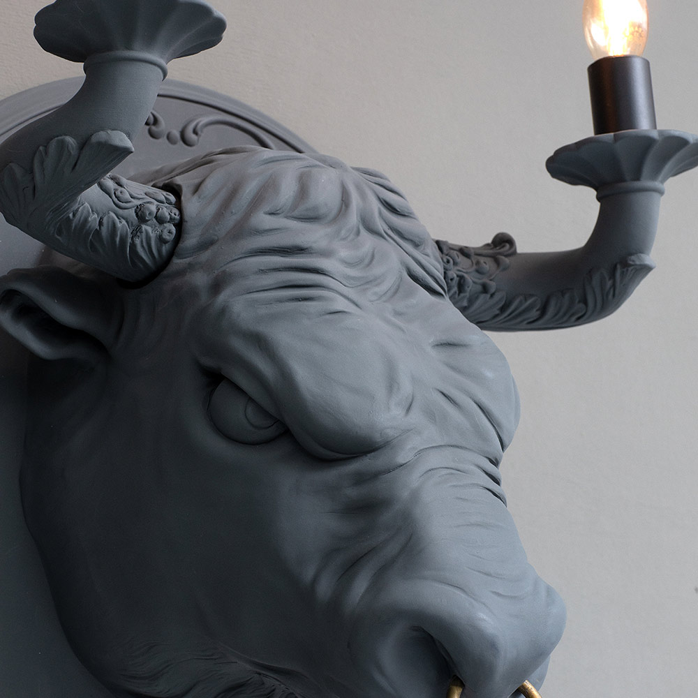 Toto originální a jedinečné nástěnné svítidlo má moderní a roztomilý design ve tvaru býčí hlavy doplněné o kroužek v nose a rohy pro světla pro lehkého a sofistikovaného ducha.