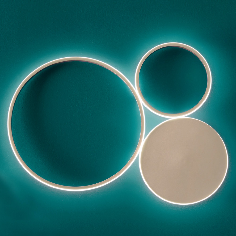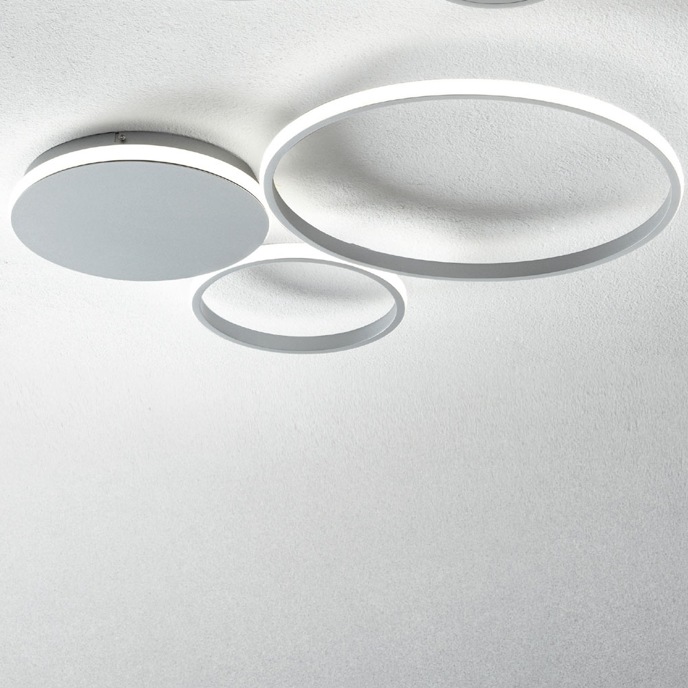 všestranným charakterem , který lze instalovat v jakémkoli domácím prostředí: vchod, kuchyň, obývací prostor, ložnice. Originální kompozice složená z kruhů různých velikostí spojených dohromady a pokrytých zvenčí mléčně bílým difuzorem, který obepíná led pás, vytváří nádherné světelné efekty na stěnách ve výsledku se
