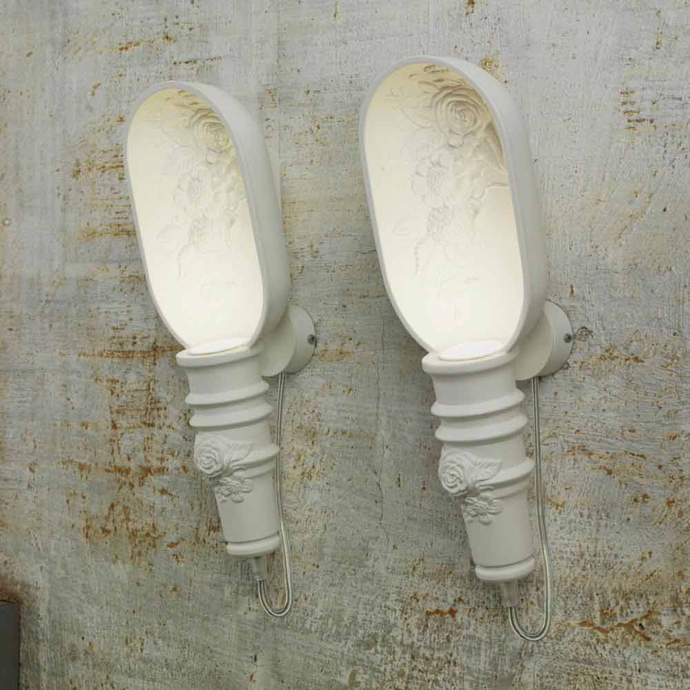 Toto originální a jedinečné nástěnné svítidlo se vyznačuje nejen svými tvary, ale také čistě bílou barvou, která je vyjádřena v romantických květinových dekoracích, aby se vešly do nejrůznějších prostorů a přinesly intimitu a zdokonalení . Doplněk chce zdůraznit autentičnost a tisíc odstínů, které charakterizují osobnost každého z nich, prostřednictvím zastoupení světelných prvků s jedinečným a inovativním designem.