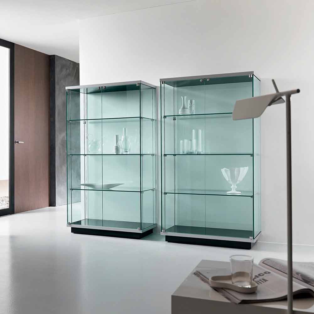 Dvoudveřová vitrína se zámkem je zcela vyrobena z průhledného tvrzeného skla se třemi policemi s podstavcem, horní částí a soklem v černém lakovaném dřevě.