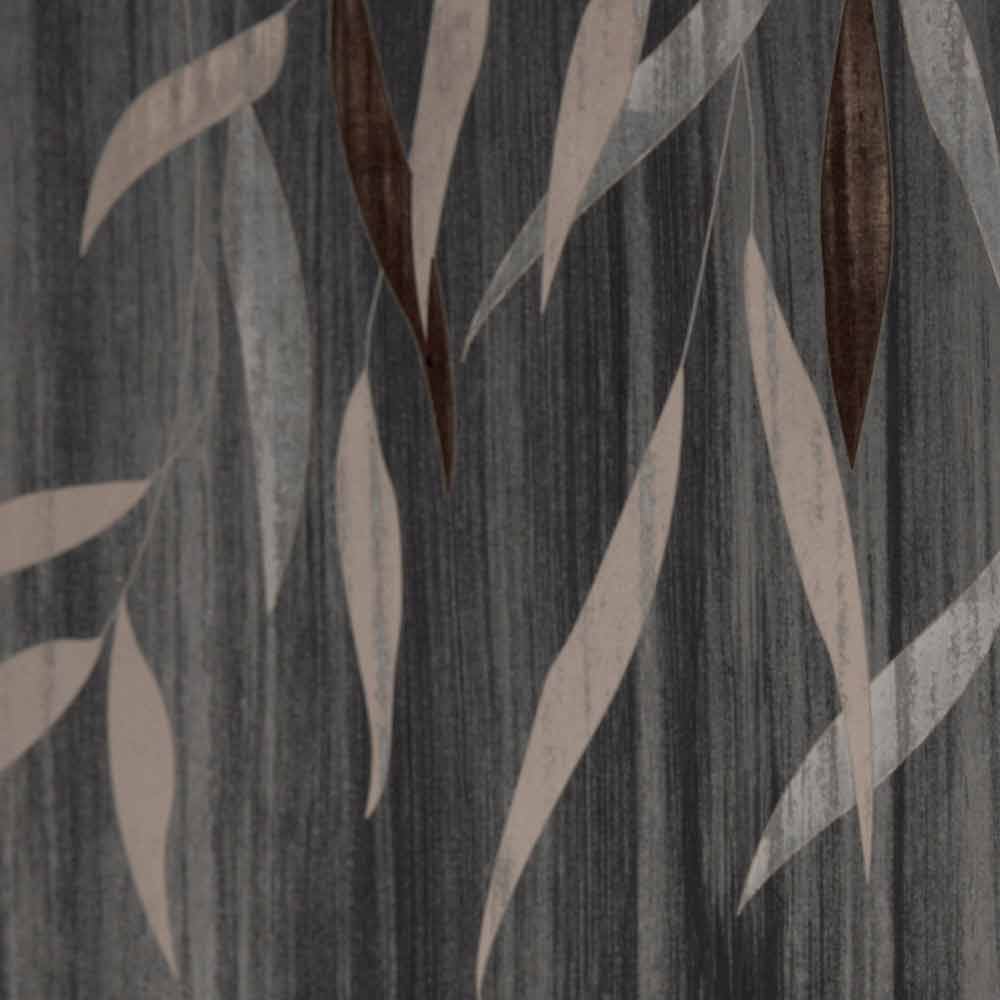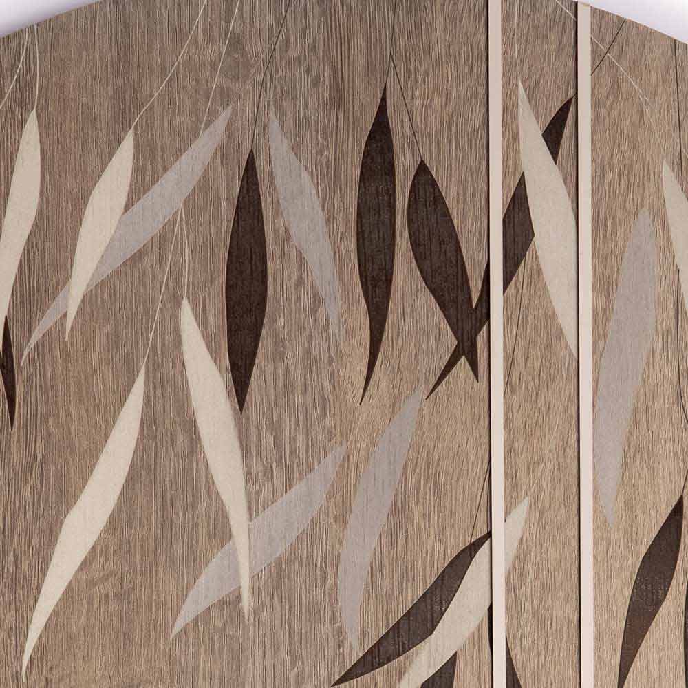 lakovanými dřevěnými dekoracemi zobrazujícími listy vrby v různých odstínech.