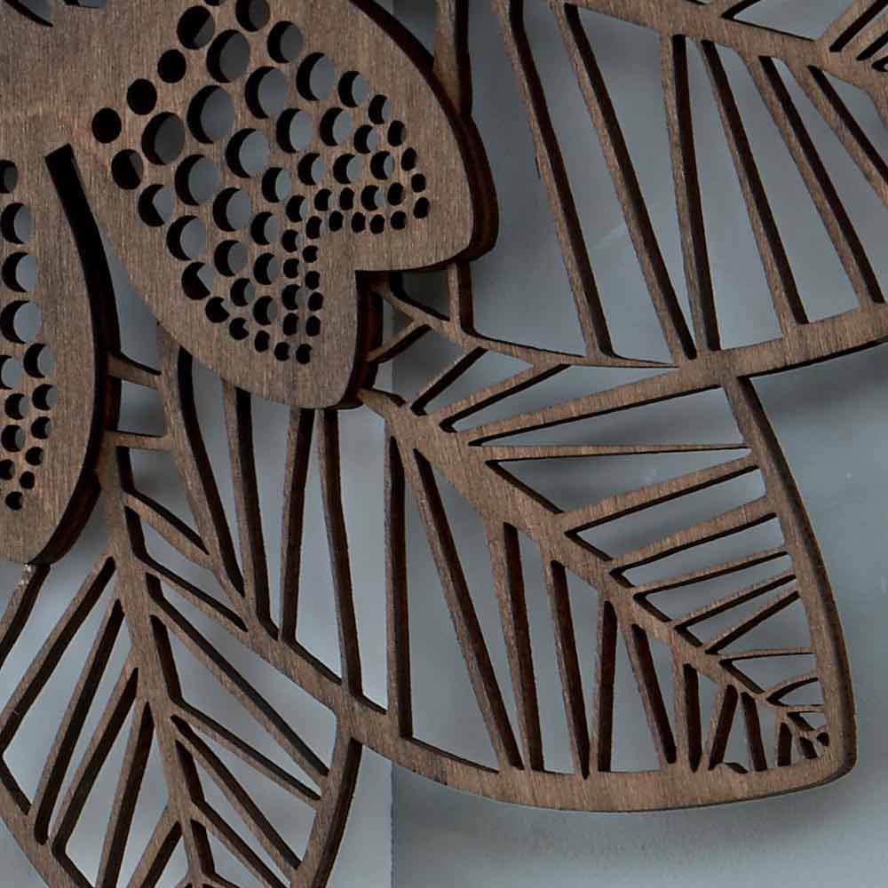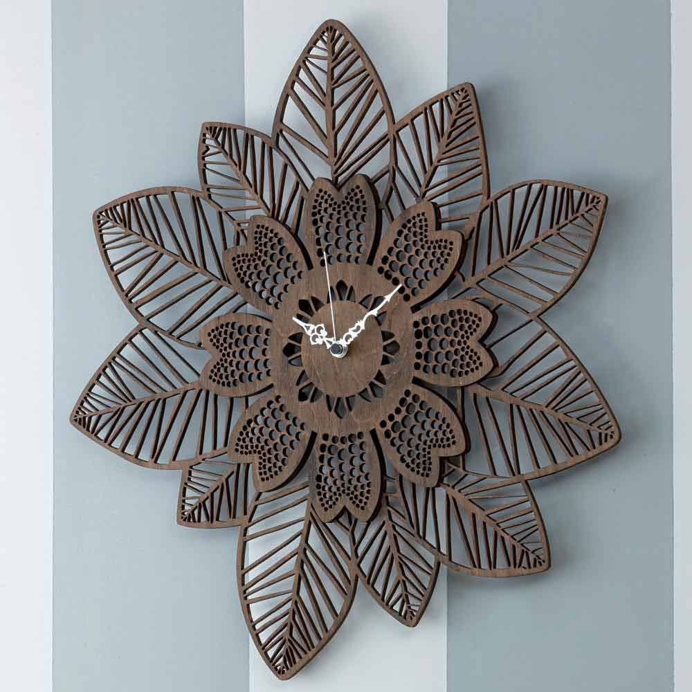 Konkrétní nástěnné hodiny , vyrobené ze světlého nebo tmavéhodřeva řezaného laserem, jehož tvar připomíná tvar nově kvetené květiny.