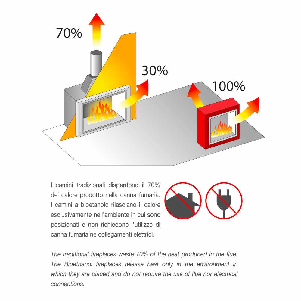 Navíc, na rozdíl od tradičních krbů, které rozptylují 70 % produkovaného tepla v kouřovodu, u krbů na bioetanol nedochází k rozptylu tepla, protože nemají žádný kouřovod ani elektrické připojení, a proto je účinnost 100 %.