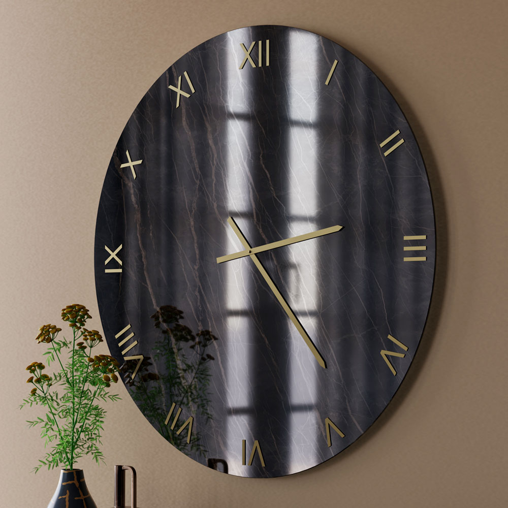Skleněné nástěnné hodiny s povrchovou úpravou Black Gold s mramorovým efektem a sítotiskem jsou výrazným doplňkem nábytku, ideálním pro elegantní a moderní prostory. Tmavé pozadí, zvýrazněné jemným žilkováním inspirovaným mramorem Black Gold, dodává prostoru vizuální hloubku a výrazný charakter.