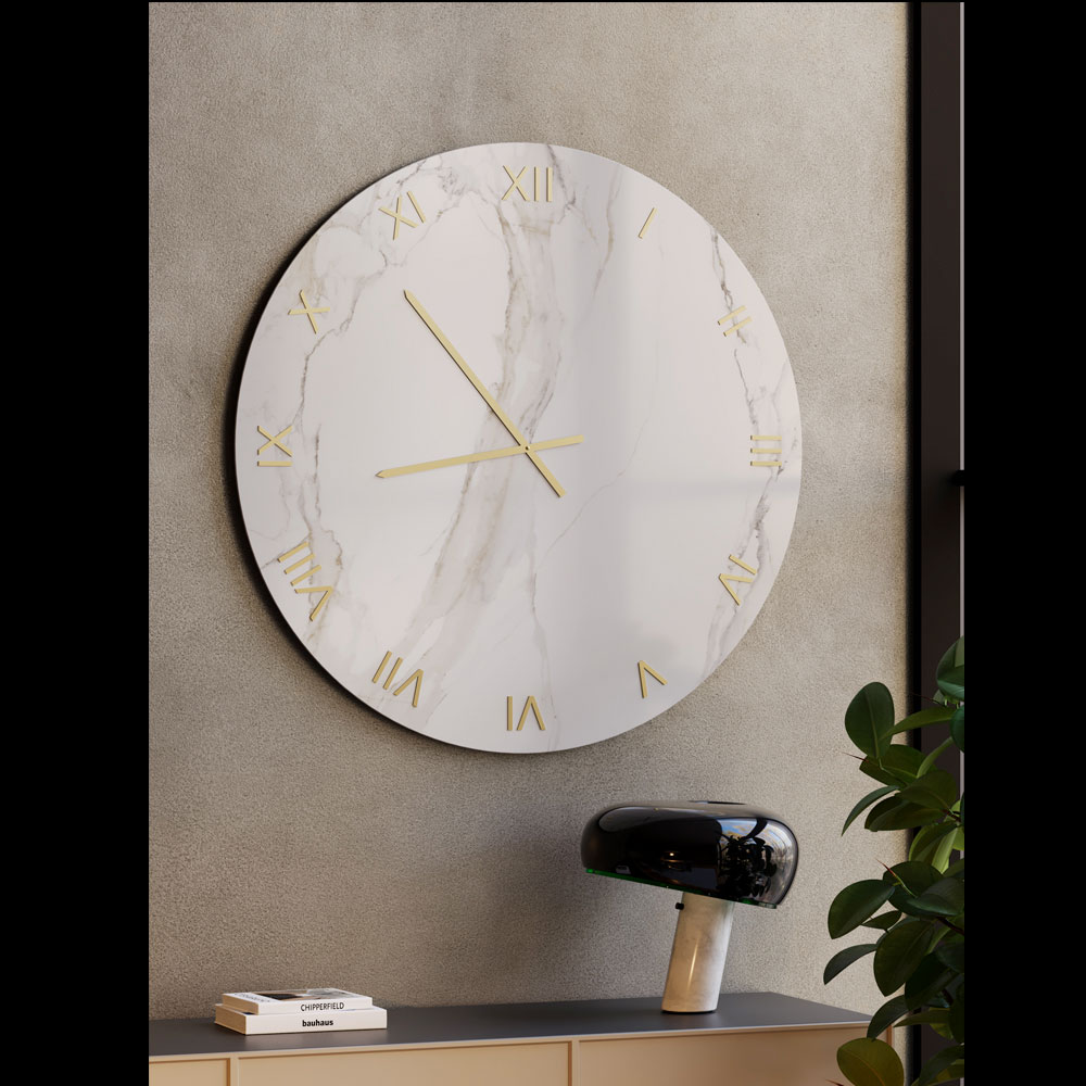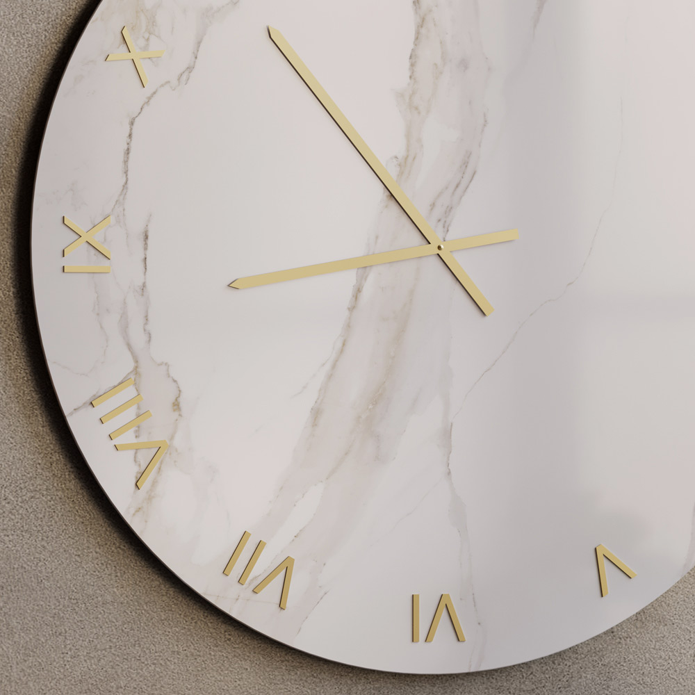 Skleněné nástěnné hodiny s povrchovou úpravou s efektem mramoru Calacatta, potisknutou sítotiskem, jsou rafinovaným kusem nábytku, který je navržen tak, aby vylepšil moderní a současné prostory nádechem nadčasového luxusu. Skleněný povrch zdůrazňuje jemné žilkování inspirované přírodním mramorem a vytváří elegantní souhru světla a hloubky.