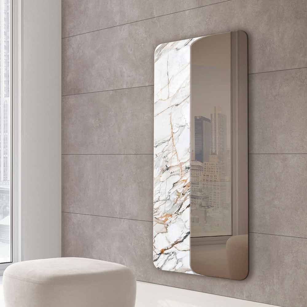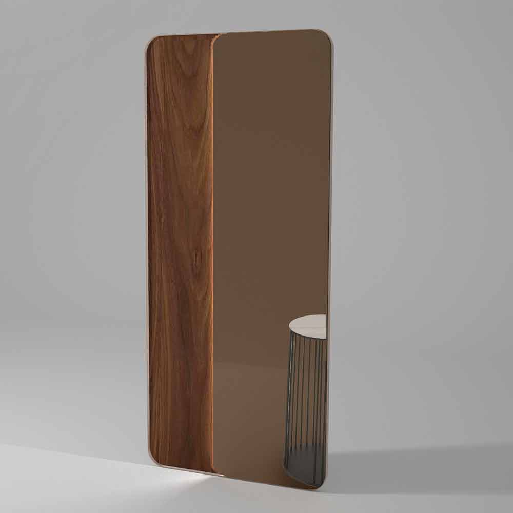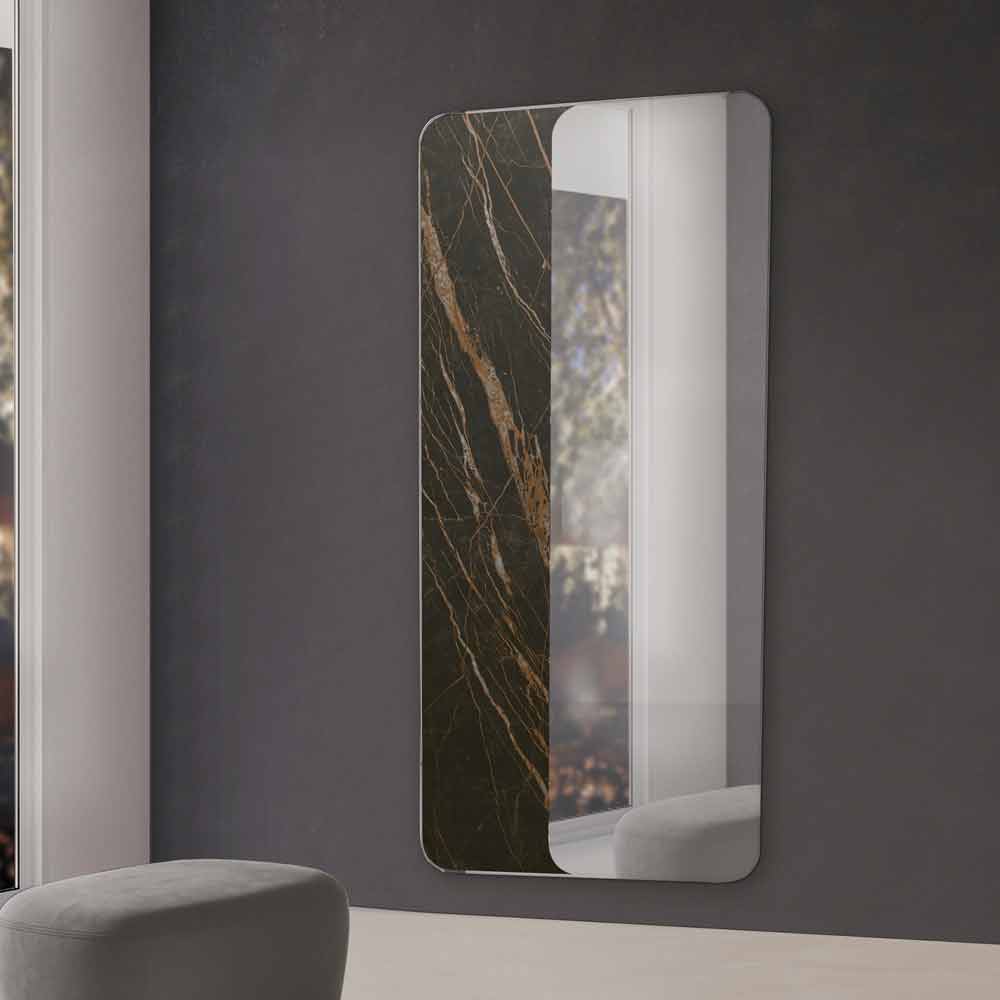 Nástěnné zrcadlo zcela vyrobené v Itálii sestávající z vnějšího kovového prstence a boční vložky z keramiky nebo dřeva doplněné zrcadlem obloženým bronzovou nebo stříbrnou povrchovou úpravou.
