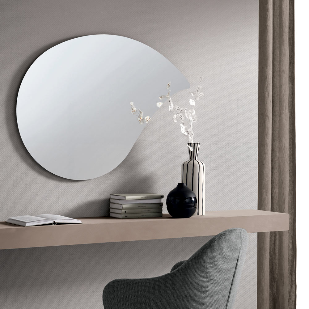 Měkký, protáhlý tvar dodává zrcadlu lehký a harmonický vzhled, který dokáže obohatit stěnu o rafinovaný grafický nádech. Tento základní design umožňuje zrcadlu stát se dekorativním prvkem schopným zesílit světlo a vytvořit hloubku v prostoru.