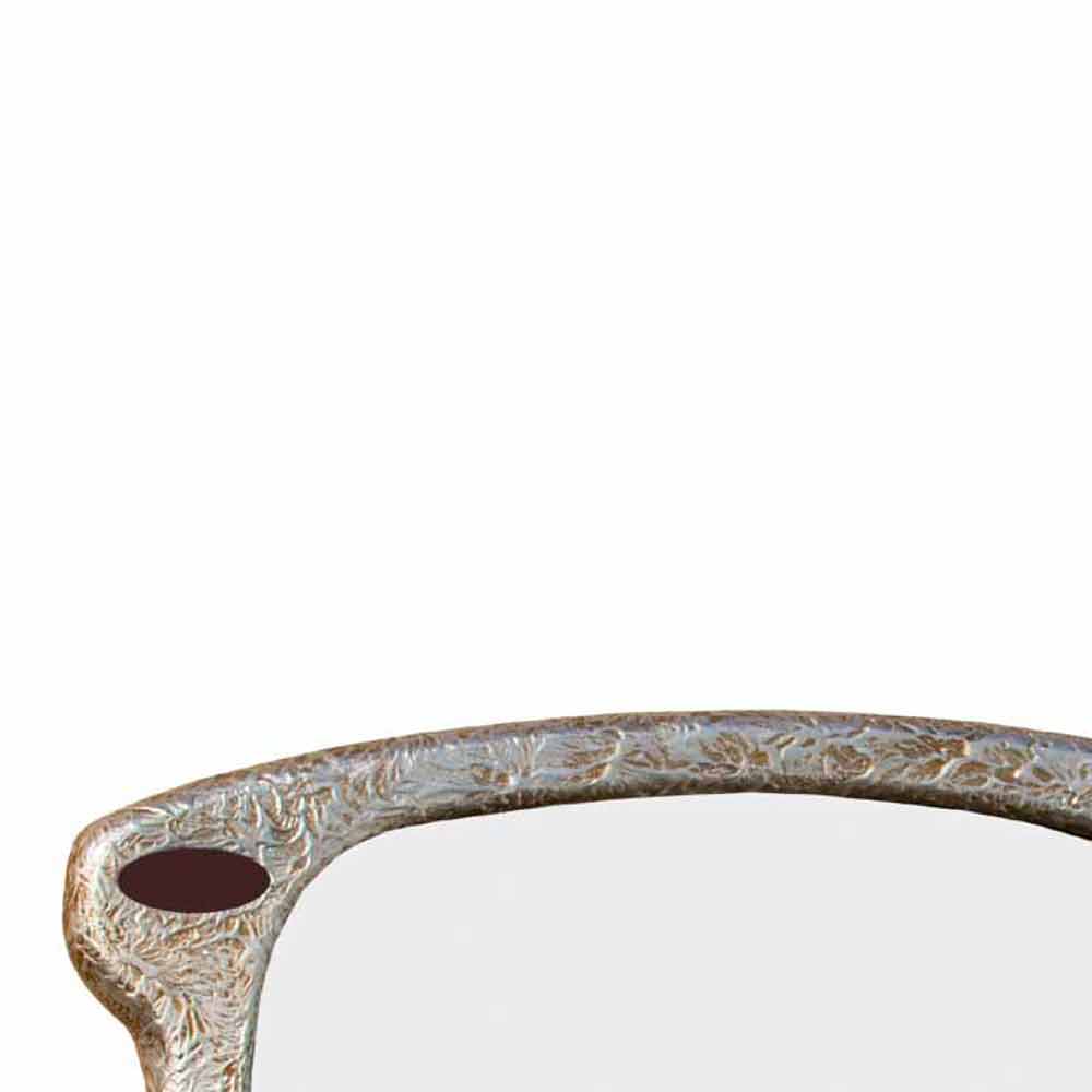 Zrcadlo se vyznačuje velkým stylem a elegancí. Vyrobeno z MDF, velmi odolného a nezměnitelného materiálu v průběhu času, s tvarovanou konstrukcí a ručně zdobené stříbrnými listy na texturovaném materiálu, příjemné na dotek a příjemné vidět.