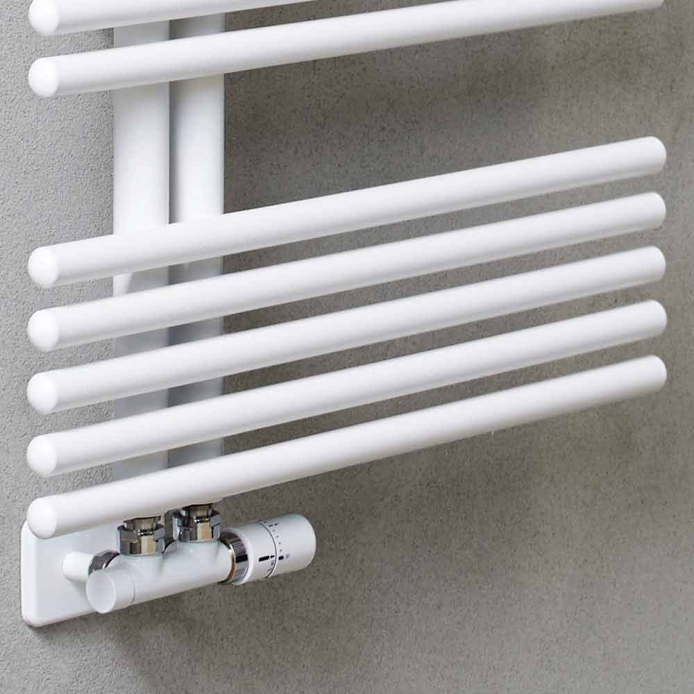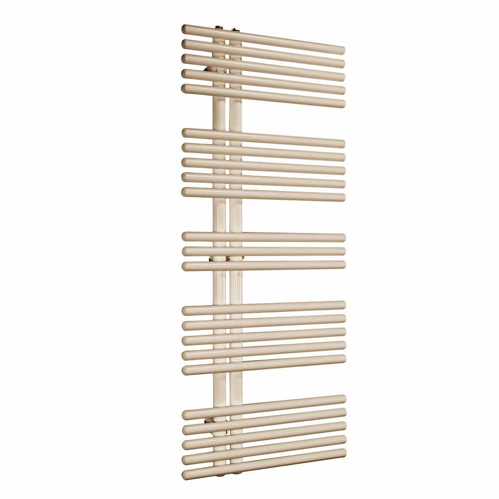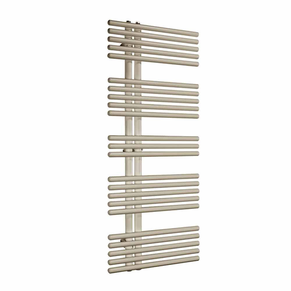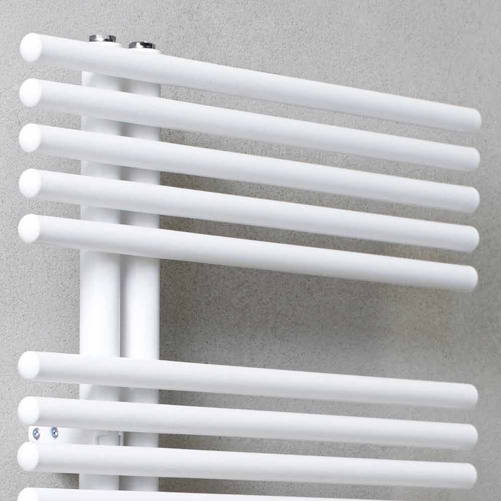 ohřívač ručníků má design vyrobený ze svislých trubek o průměru 35 mm a vodorovných kulatých trubek o průměru 25 mm. Díky svému modernímu a zvláštnímu tvaru je
