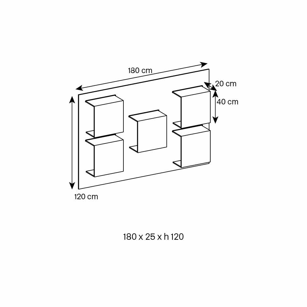 Vyrobeno z dřevěného panelu v ořechovém provedení canaletto s 5 průhlednými skleněnými policemi a je k dispozici v horizontálním nebo vertikálním provedení.