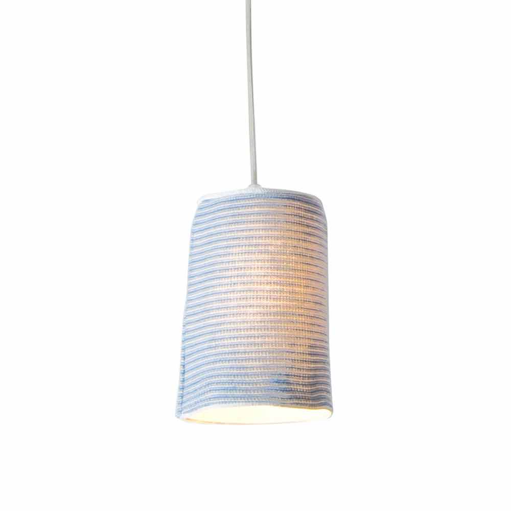 Závěsná svítilna nastíněná strukturou nebulitu (inovativní materiál vyrobený z pryskyřice a vlákna) pokrytý pruhovanou vlnovou přízí v barvách: