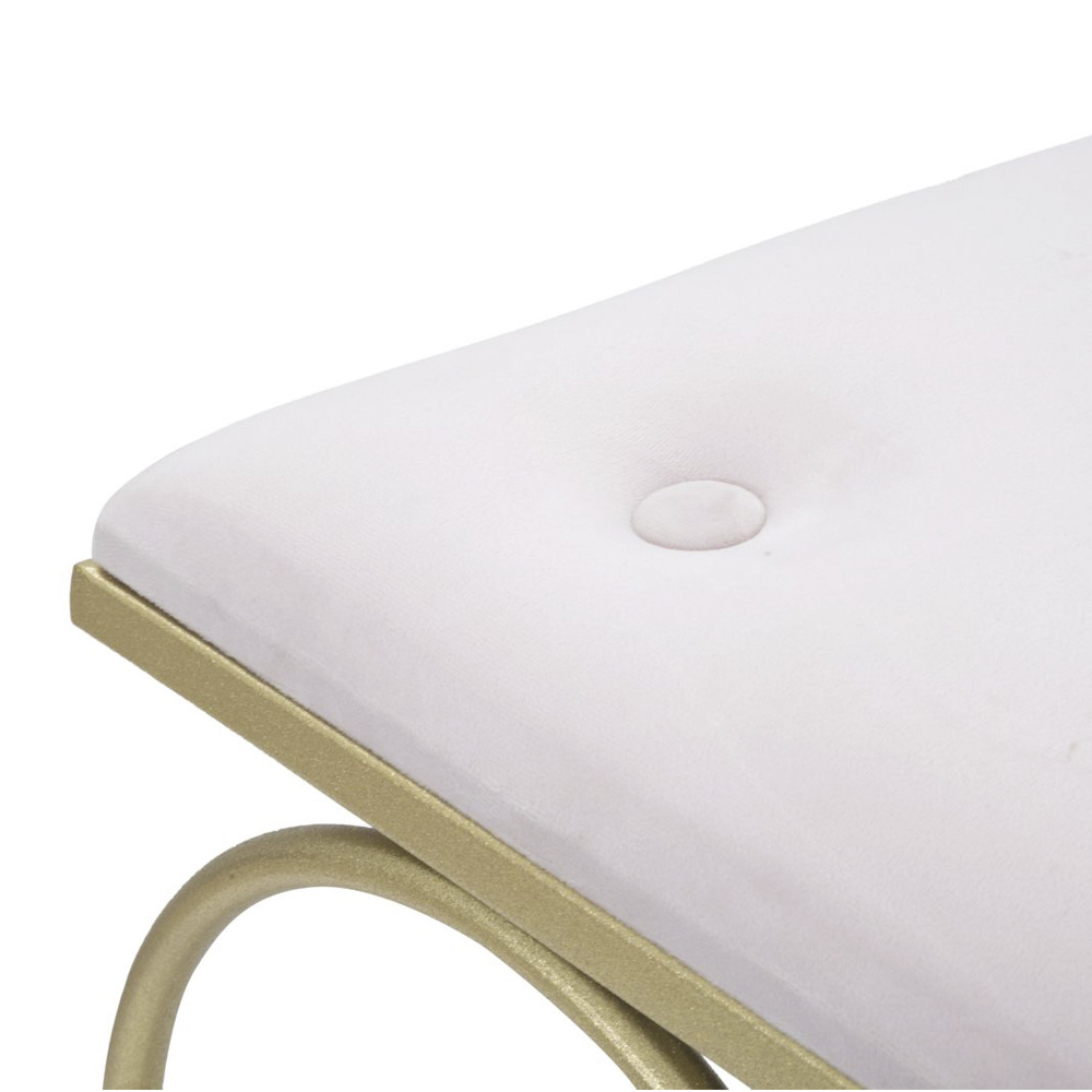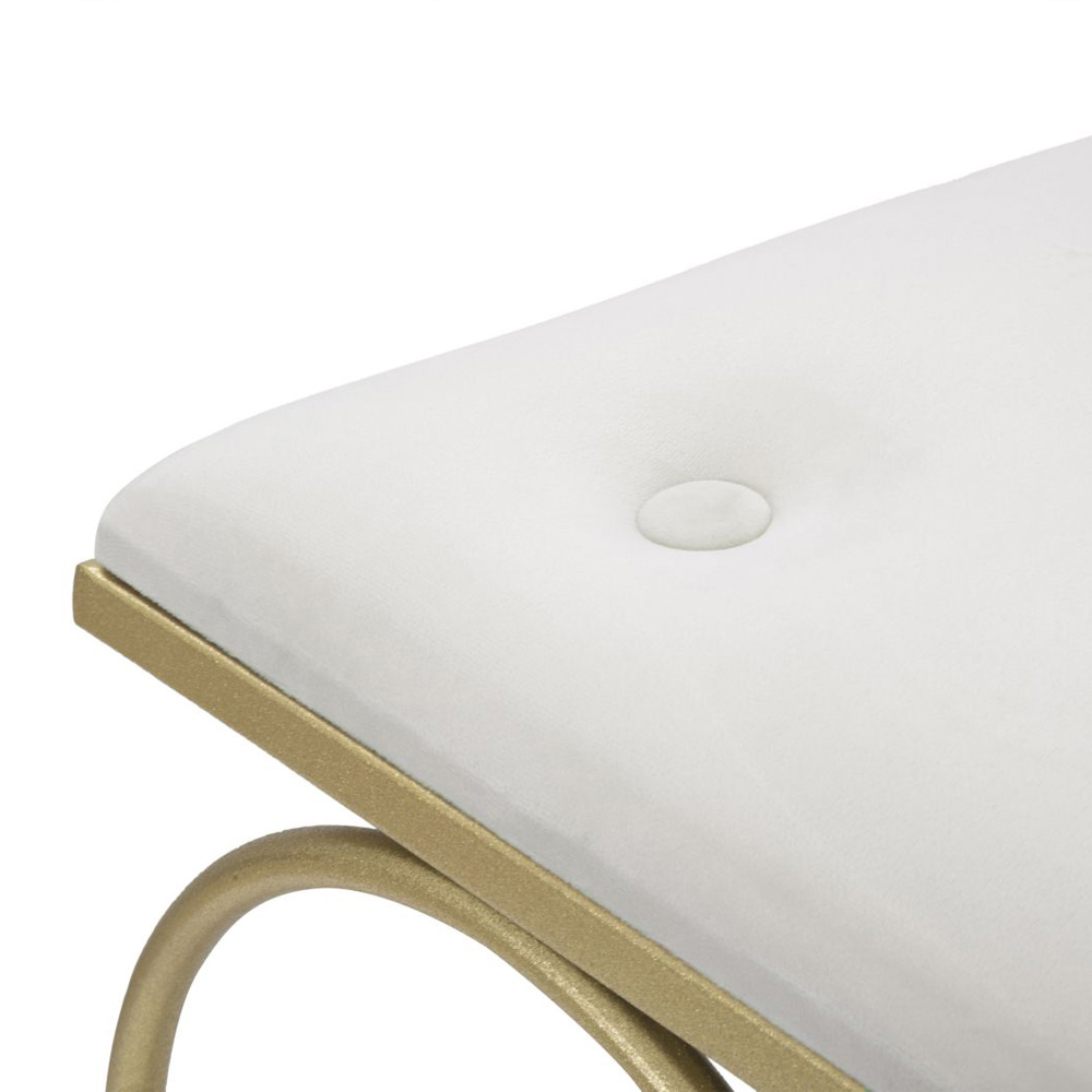 Moderní nízká stolička se železnou strukturou se zlatým povrchem a sedadlem čalouněným houbou a