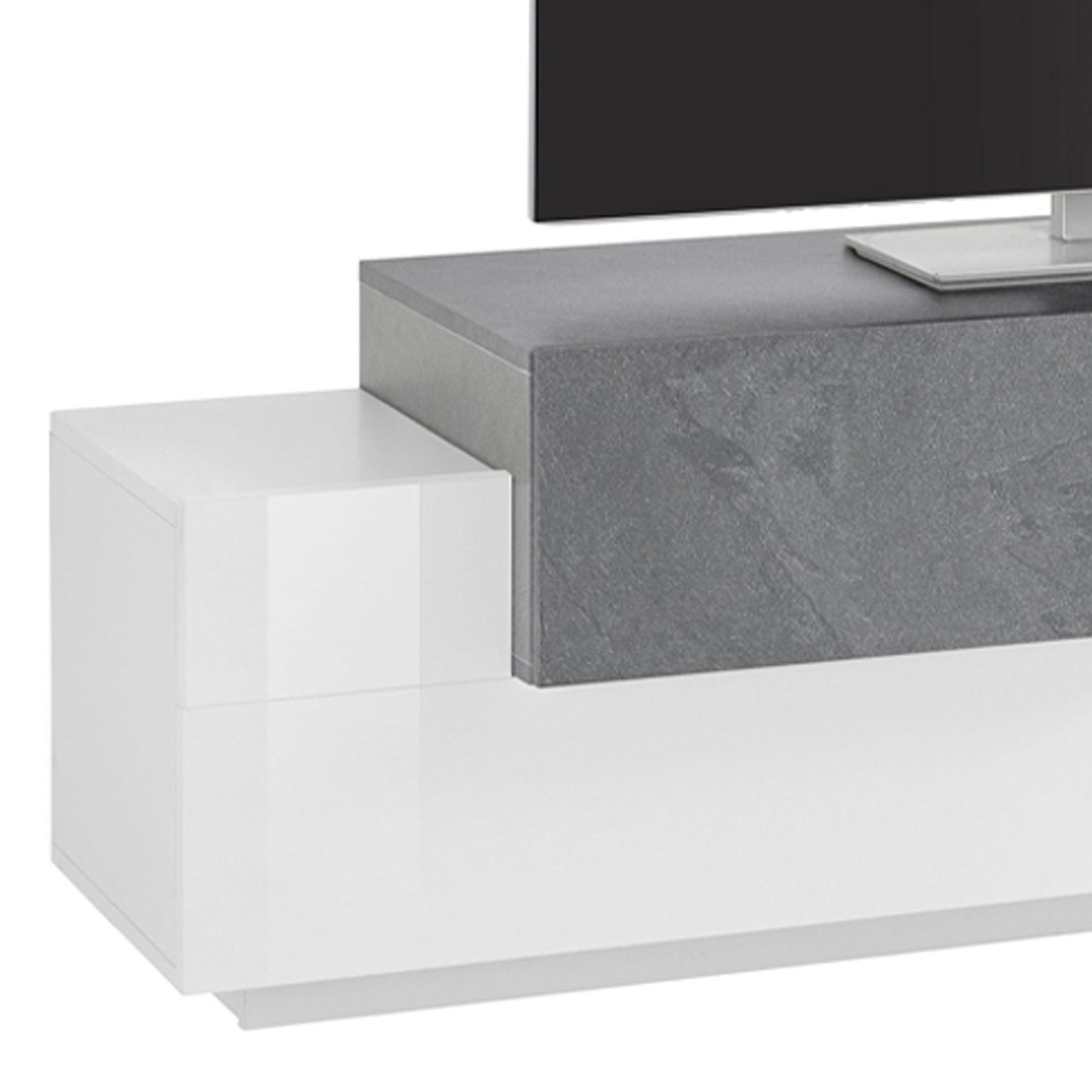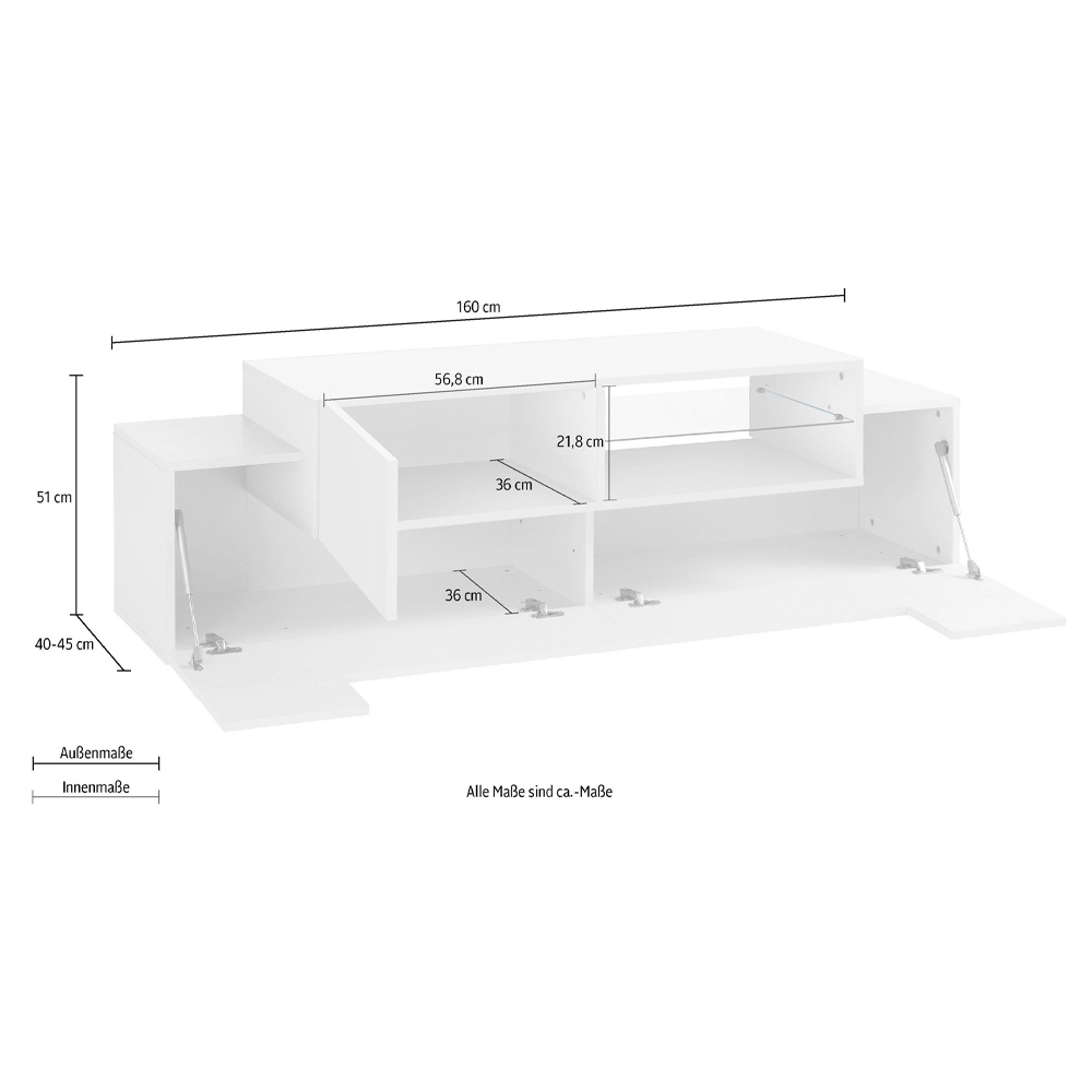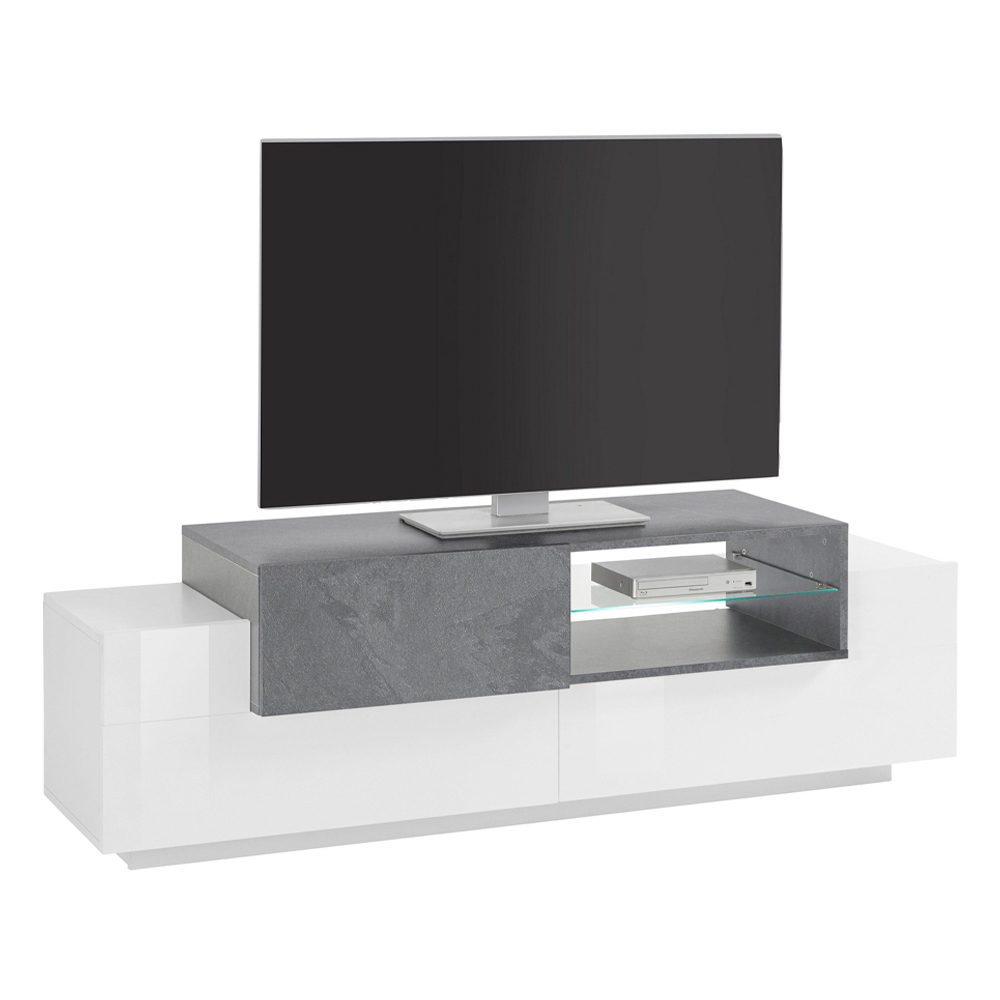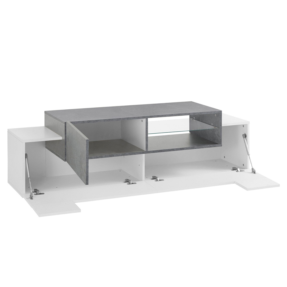 Nízká TV skříňka do obývacího pokoje se skládá ze 2 bočních výklopných dvířek z lesklého bílého lakovaného dřeva a 1 výklopných dvířek z melaminového dřeva dostupných ve dvou povrchových úpravách s centrální otevřenou přihrádkou se skleněnou policí. Takto vytvořený design představuje sugestivní a současný kontrast pro umístění