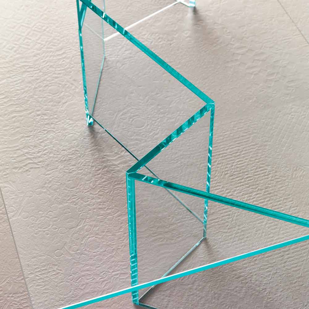 Je vyroben výhradně z extra čirého skla pro spodní i horní část, jedná se o kus nábytku ručně vyráběného v Itálii z vysoce kvalitních materiálů, ideální pro obývací prostor.