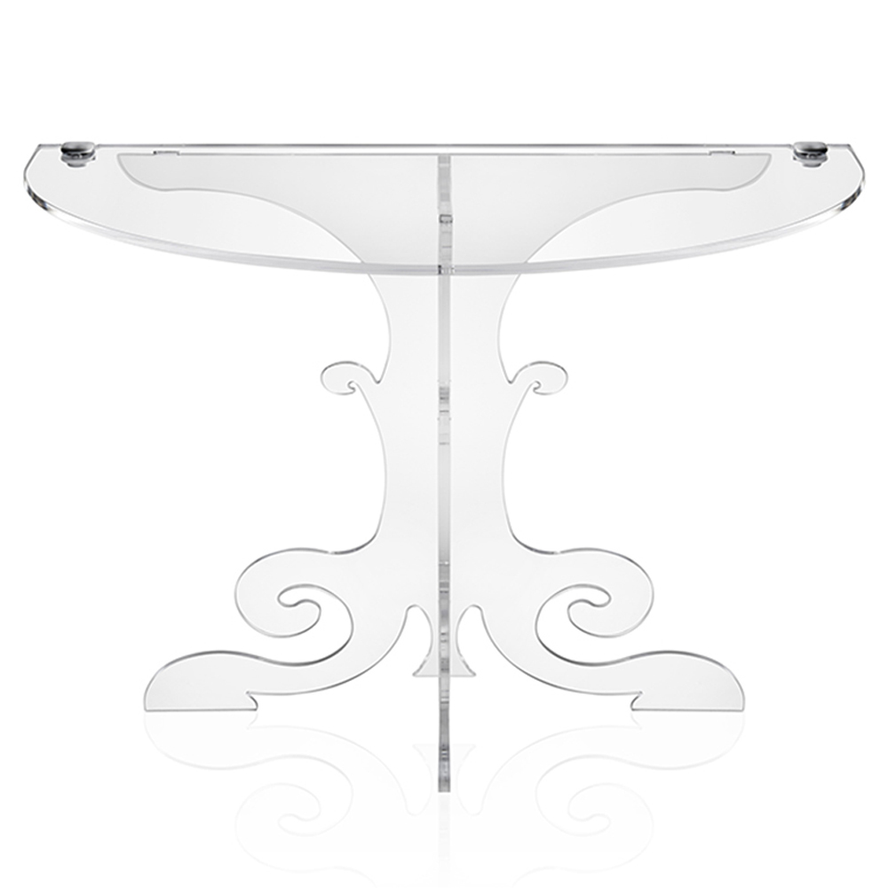 Noční stolek TIANA je inspirován nástěnnými konzolami Ludvíka XVI. z konce 18. století, nově interpretovanými nejtechnologičtějšími transparentními materiály: 100% PMMA akrylový krystal z panenského polymeru.