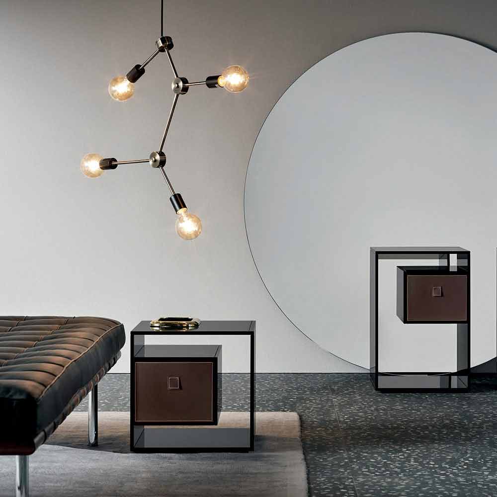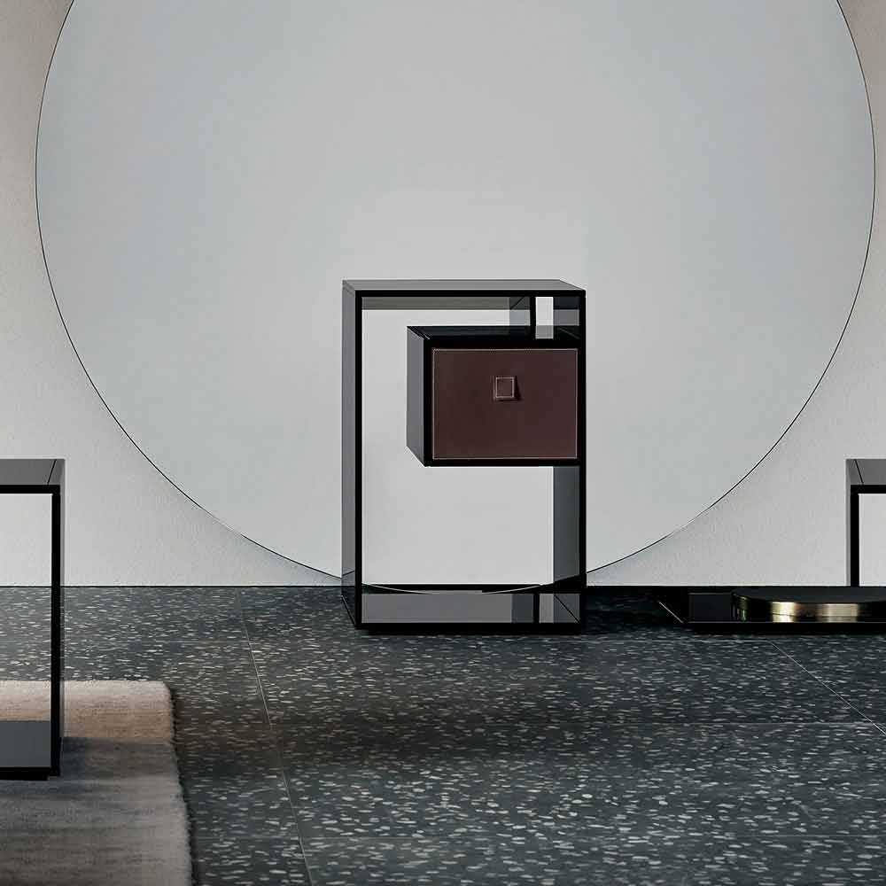 Tento noční stolek se vyznačuje elegantním a minimálním designem zcela vyrobeným z kouřového skla.