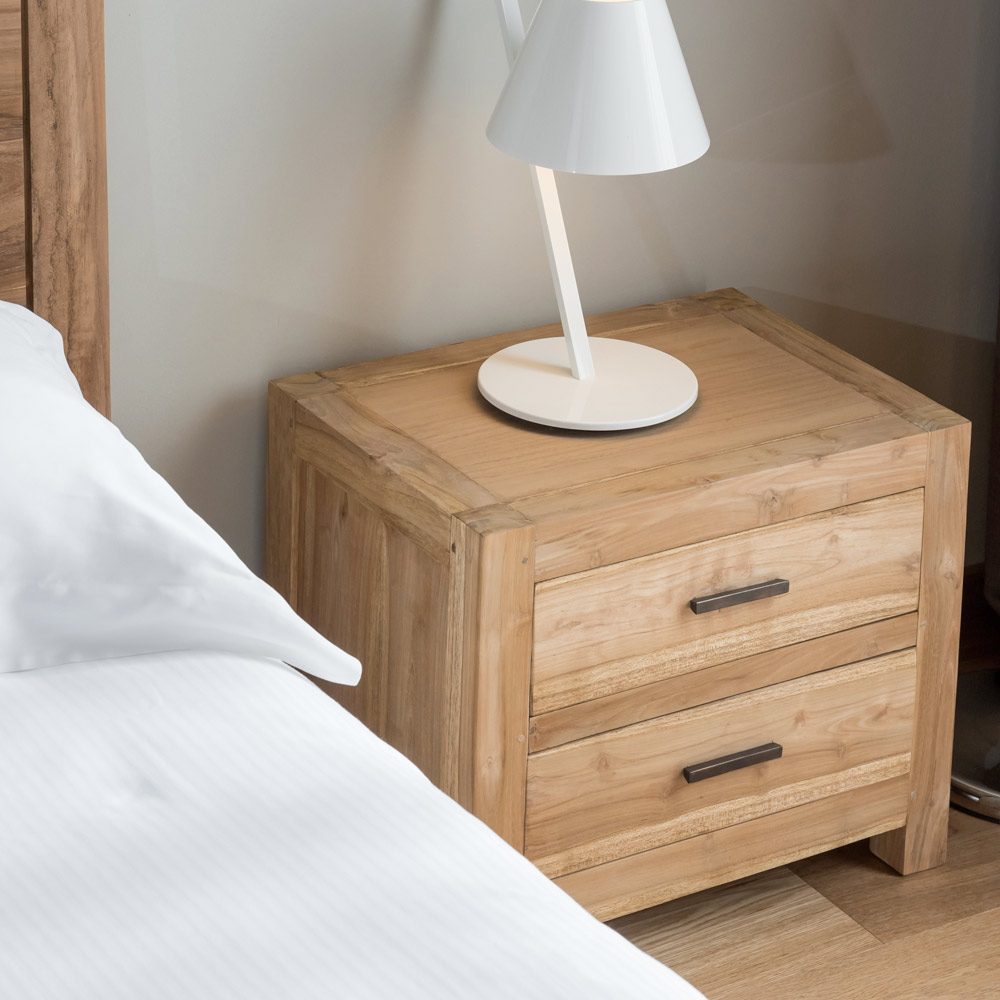 Tento masivní teakový noční stolek je kompaktní a elegantní kus nábytku, ideální pro doplnění vaší ložnice přírodním a nadčasovým stylem. Řemeslné zpracování a přírodní dřevěná kresba dodávají tomuto kusu nábytku teplý a autentický vzhled.