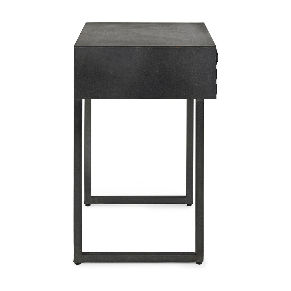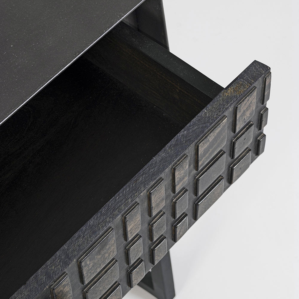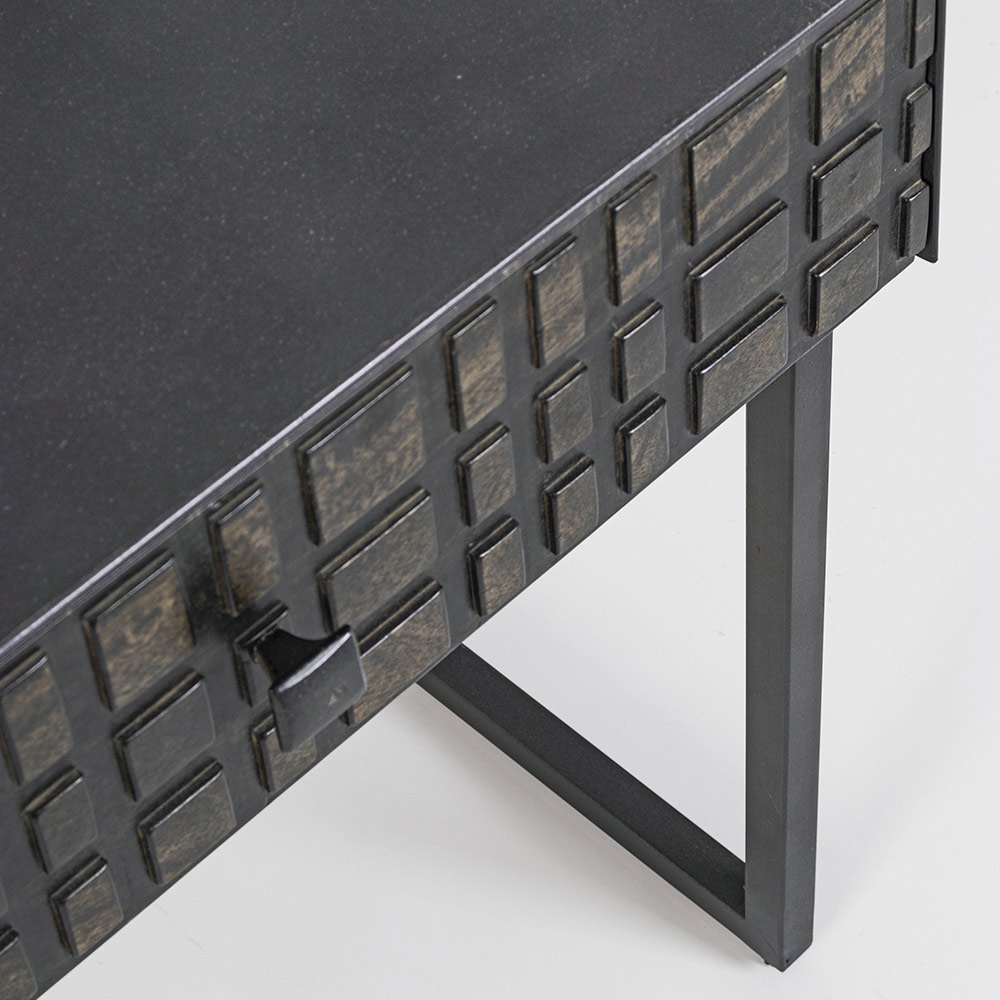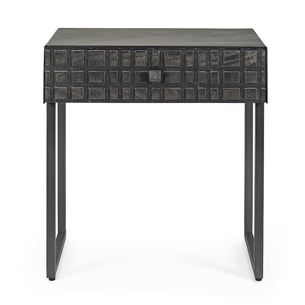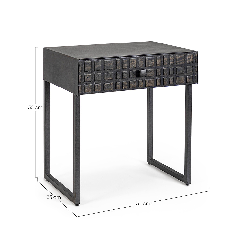 Noční stolek z oceli se zásuvkou z mangového dřeva v etnickém designu.