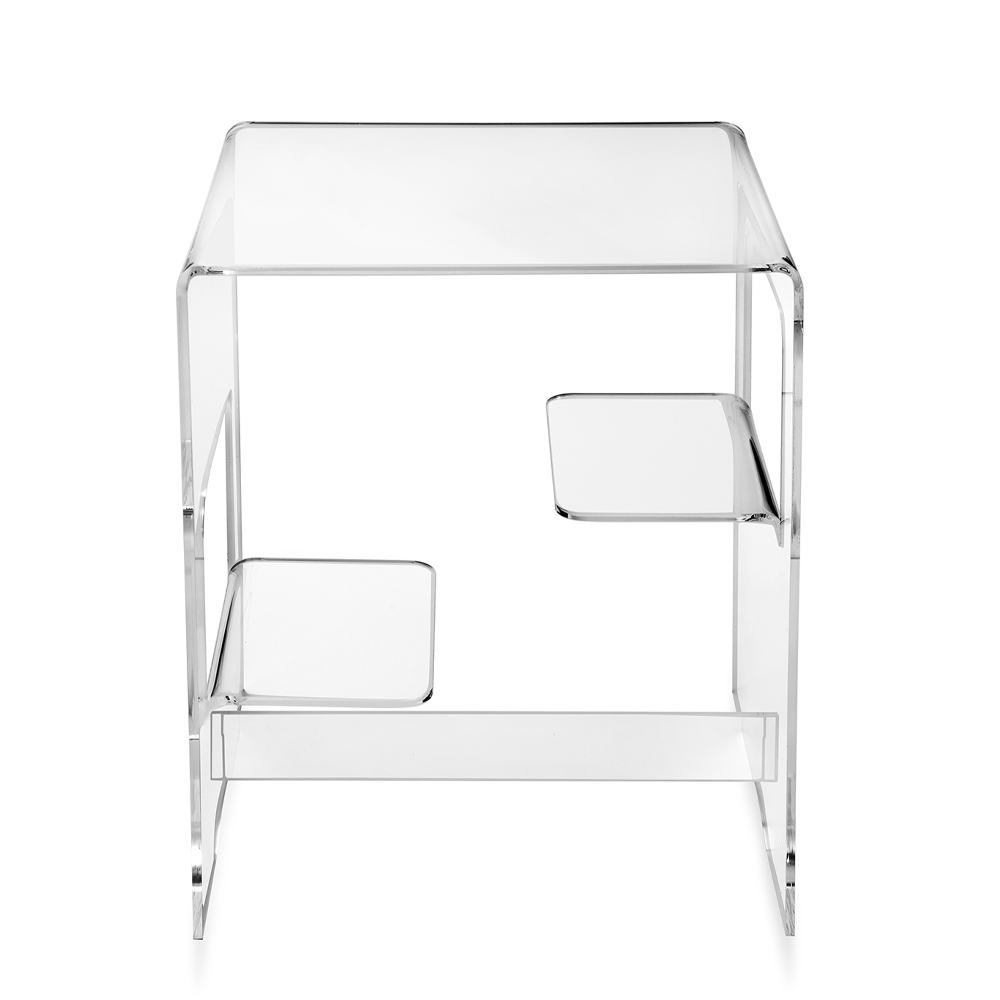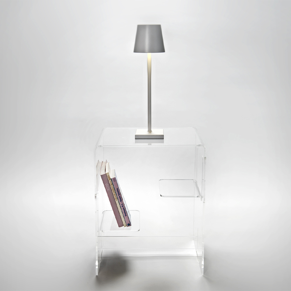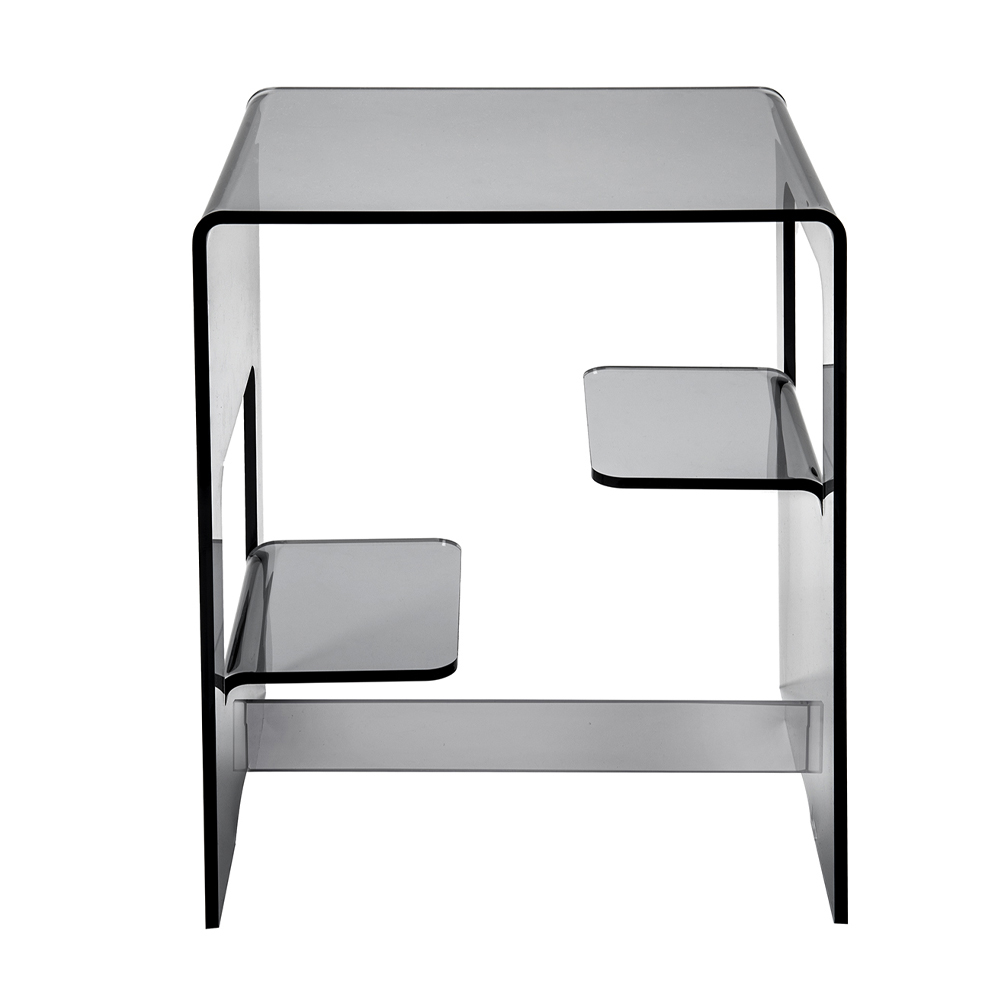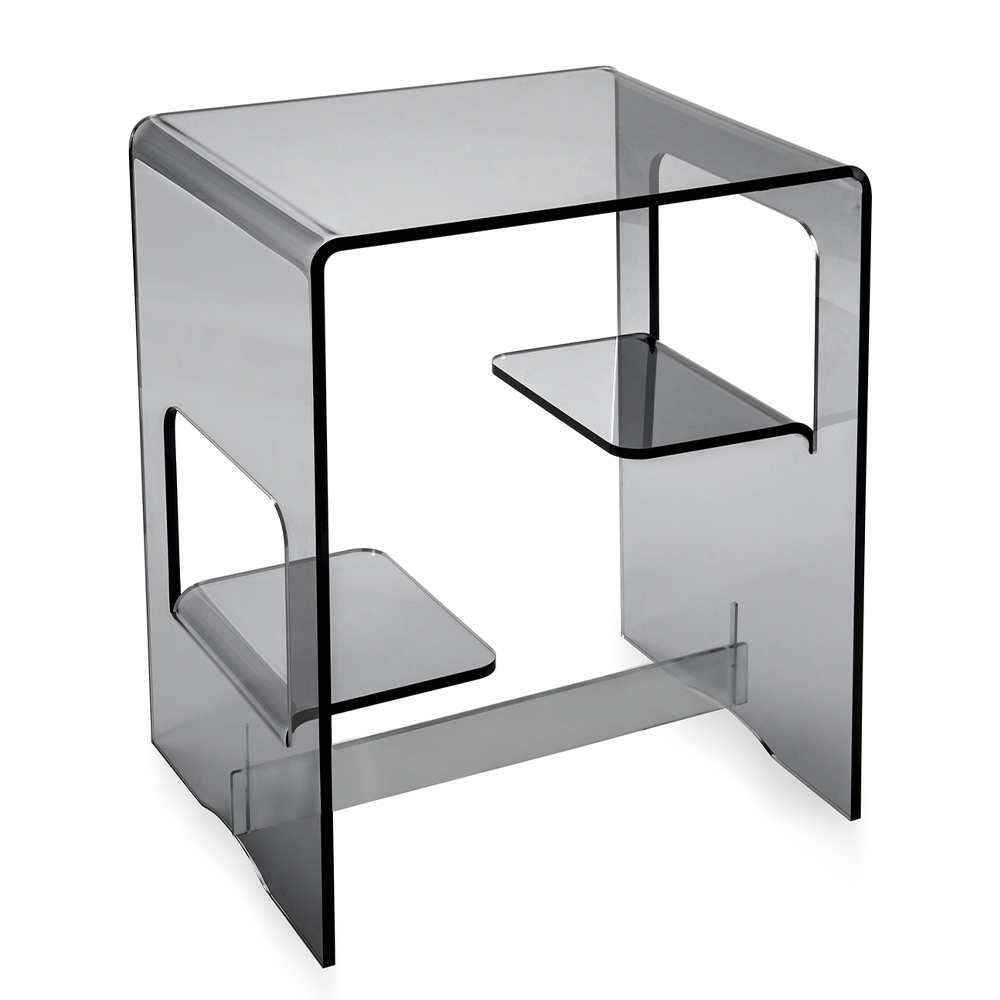 Moderní designový noční stolek nebo konferenční stolek z průhledného nebo kouřového plexiskla vyrobené v Itálii.