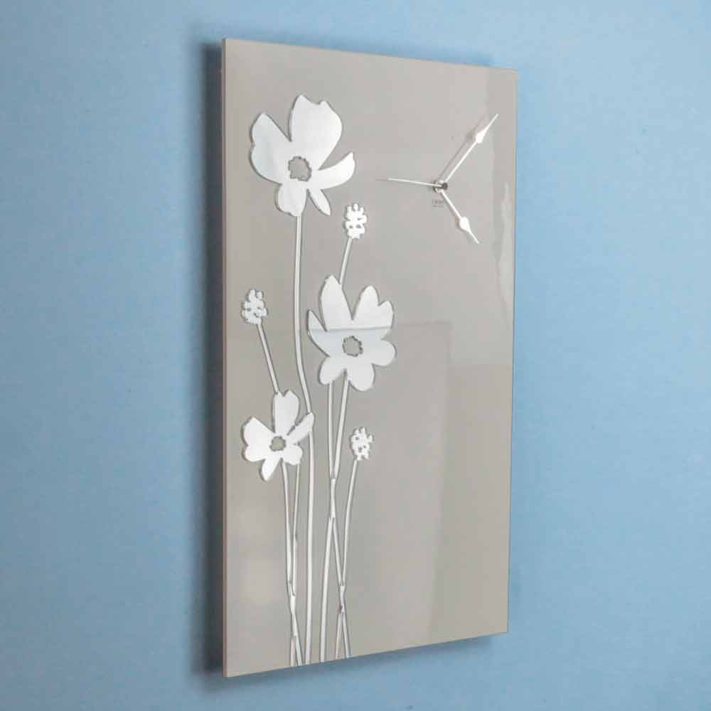 Obdélníkové nástěnné hodiny moderního designu z bílého dřeva s vykládanými zrcadly z plexiskla, vyrobené v Itálii.