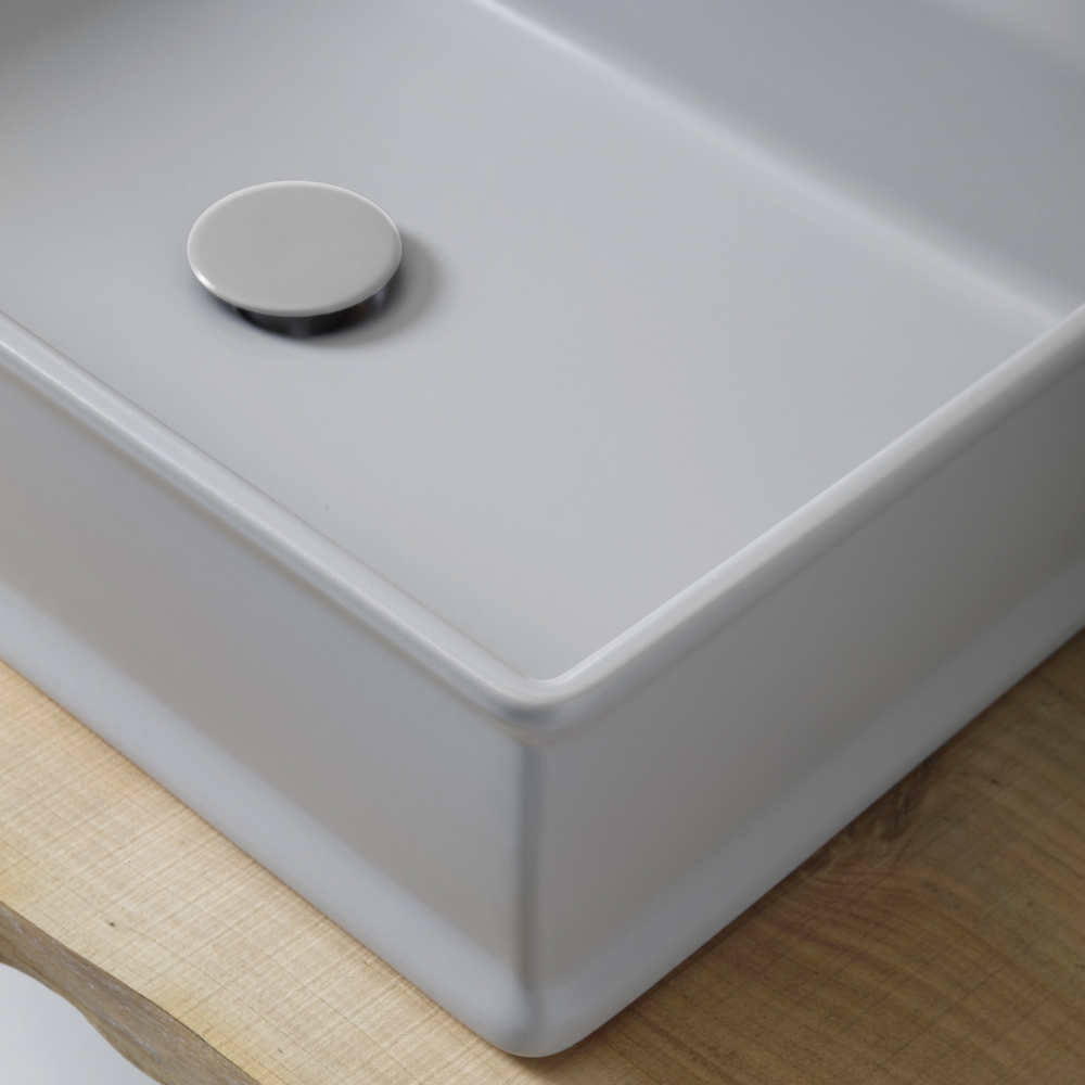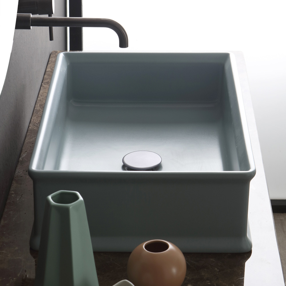 Obdélníkové umyvadlo na desku vyrobené z neprůhledné barevné keramiky díky řemeslnému zpracování 100% Made in Italy . Design charakterizovaný silnými a impozantními liniemi a rysy činí z tohoto kusu nábytku perfektní současnou reinterpretaci estetiky s retro duší díky použití barev, které dodávají životu exkluzivní a vytříbený výsledek .