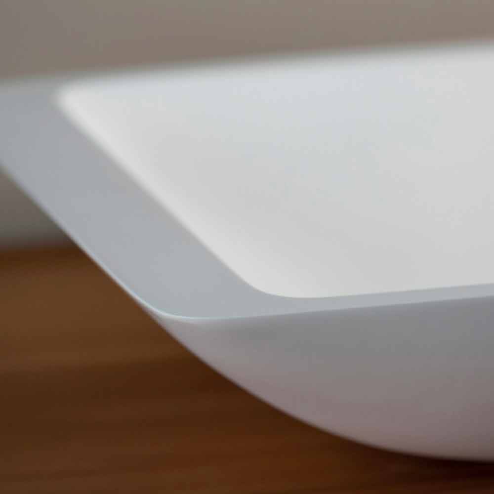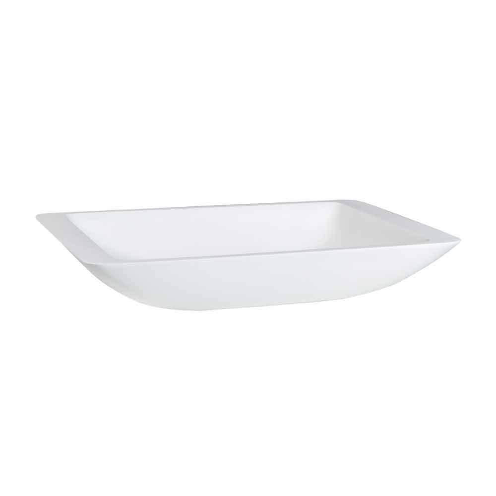 Obdélníkové bílé umyvadlo na desku, moderní design.