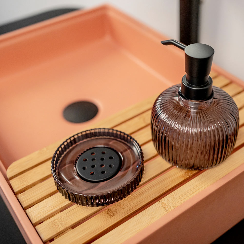 Obdélníkový teracový dřez na desku má zářivou oranžovou povrchovou úpravu, která je skutečným vyjádřením stylu ve světě interiérového designu. Nejen, že jde o etnochický a popový styl, ale nabízí také praktičnost díky své prostorné vaně . Odnímatelný vršek z bambusu je důmyslným klenotem, ideální pro uchování doplňků a kosmetiky po ruce. Tento kousek je ideální pro přidání nádechu barvy a osobitosti do každé současné koupelny a dokonale se hodí k nejoblíbenějším obkladům stěn. Předmět, který nezůstane bez povšimnutí, připravený stát se vizuálním opěrným bodem vašeho koupelnového prostoru.