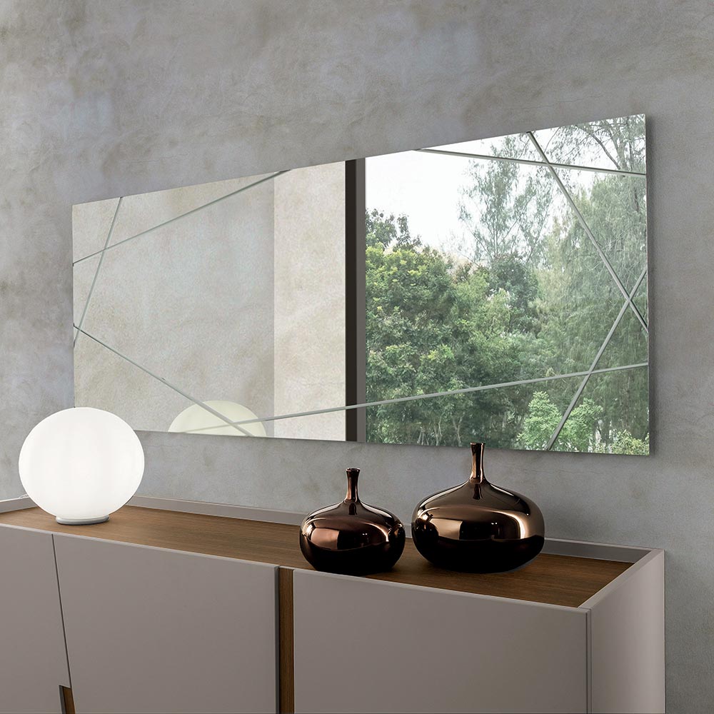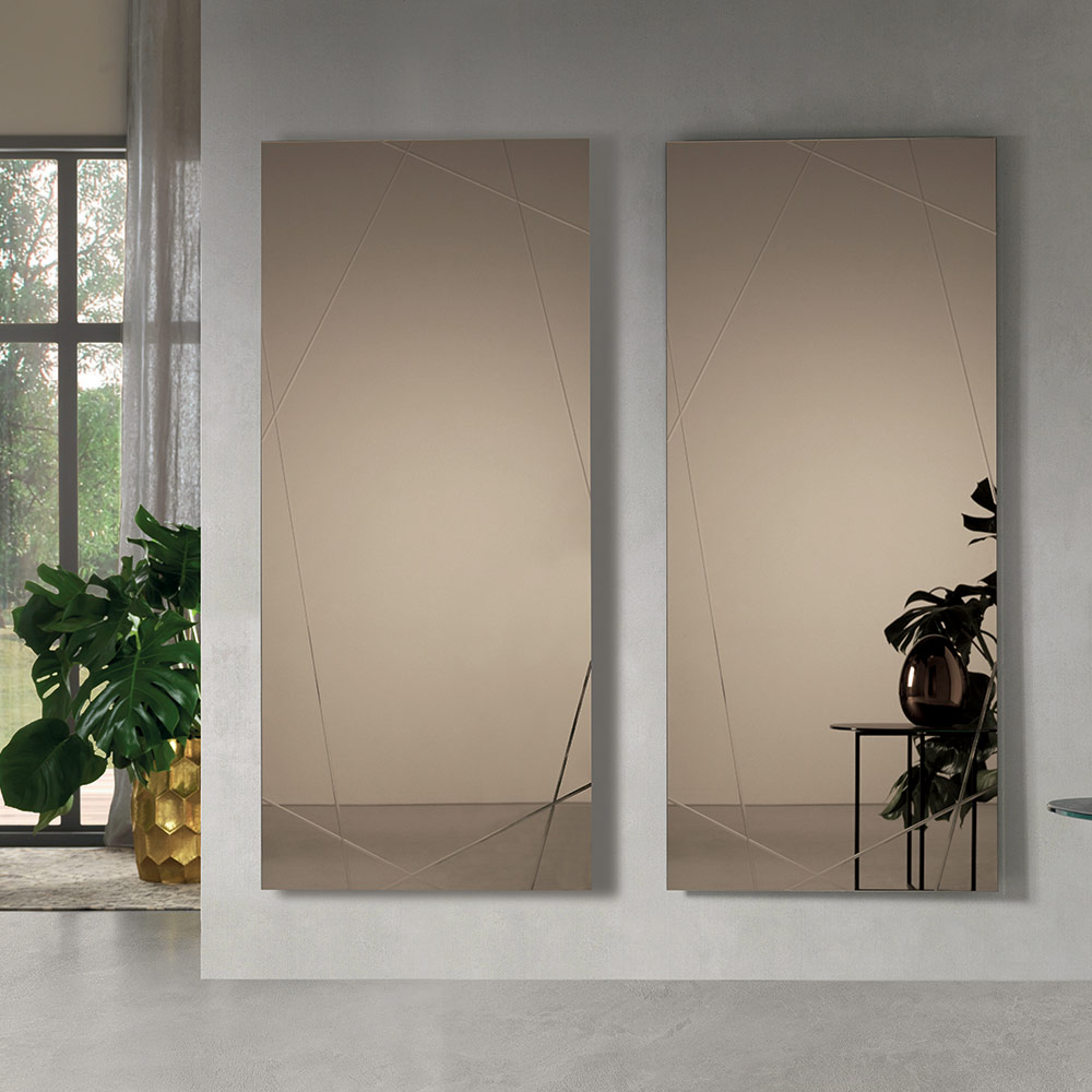 Elegantní nástěnné zrcadlo vyrobené v Itálii , ideální pro zkrášlení prostor, jako je vstupní hala , obývací pokoj nebo ložnice . Jeho základní, moderní design vyniká čistými liniemi a propracovanými grafickými detaily, které obohacují reflexní povrch.